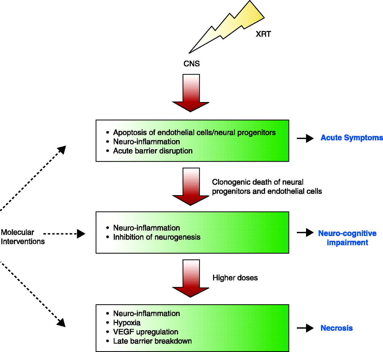 A model of molecular and cellular responses in the irradiated CNS. Neuroprotective interventions can be directed to potentially reversible targets of the injury response. Note that early injury