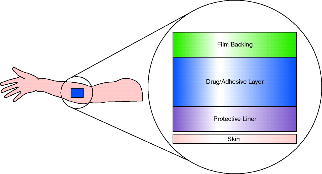 The layers that comprise the matrix (drug-in-adhesive) type of patch. The protective liner is removed prior to applying the patch to skin.