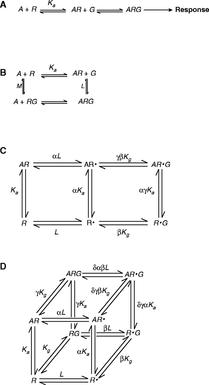 Evolution of models describing the coupling of GPCRs to G proteins. A. The earliest models of signaling evoked by GPCRs were linear, with a single receptor, upon agonist occupancy, binding to and activating a G protein, which then activated a downstream signaling pathway. B. The Ternary Complex Model (TCM); (47–48) described a relationship between receptor affinity for agonist (Ka) and receptor affinity for G (Kg), the G protein, both regulated by GTP. C. The Extended Ternary Complex Model (ECM) (49) allows for the receptor to spontaneously isomerize to an active state, R*, or to couple to G in the absence of ligand. The cooperativity factors (e.g., α, β) modify the isomerization constant, L, as well as the equilibrium association constants (Ka and Kg ) when these isomerizations occur for receptor occupied either by agonist or inverse agonist. D. The Cubic Ternary Complex Model (50), allows for the existence of inactive ARG complexes. Another cubic model (51) allows for active and inactive receptor states with no G protein coupling, and can be adapted for modeling allosteric modulation of GPCRs by small molecules, rather than by interaction with G proteins (52). Panel B modified from (48) and panels C and D modified from (52).