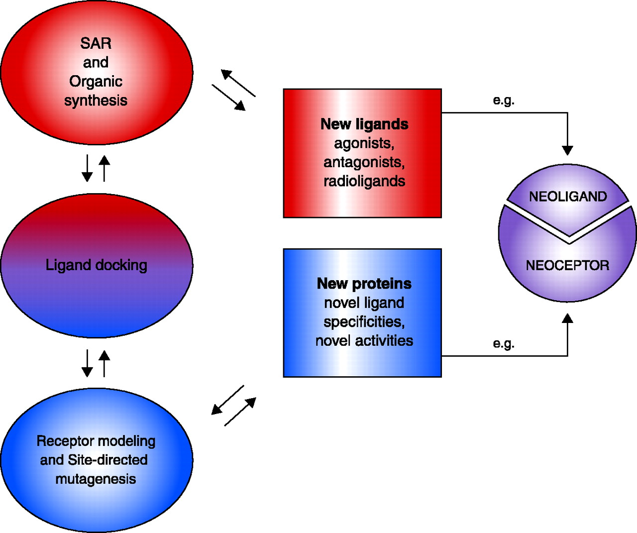 Integration of drug design and receptor modeling. Experimental data [e.g. structure-function relationships (SAR)] reveal interactions between multiple sets of ligands and receptors (i.e., both wild-type and mutant proteins); rational refinement of receptor (by mutagenesis) and ligand design (by organic synthesis) can then be suggested by ligand docking. The two stages—ligand design (red) and receptor design (blue)—are combined in an iterative manner to culminate in new ligands (e.g., agonists, antagonists, and new pharmacological probes) that will selectively bind, fail to bind, or modulate wild-type or mutant receptor proteins. A special integration of the two stages can culminate in “neoligands” that selectively bind to engineered “neoceptors.” It should be noted that GPCR modeling currently depends on the high-resolution structure of bovine rhodopsin (resting state) as template (4).