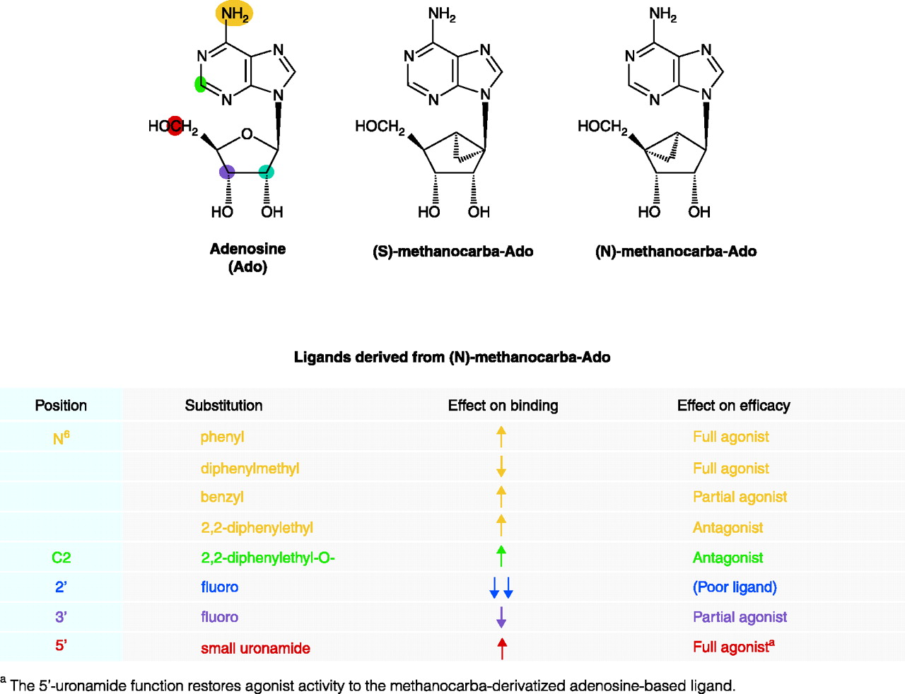 Differential effects of ligand derivatized on binding affinity and functional efficacy. The substitutions of adenosine as tabulated below the structures are offered as general examples of effects that can be observed from ligand derivitization. (Yellow indicates the N6 -position; green, C2-position; blue, 2′-position; purple, 3′-position; red, 5′-position.) The ribose moiety of the adenosine (Ado) ligand becomes effectively fixed in either the (N) or (S) conformation upon replacement with the methanocarba ring system as shown. (For a conformational representation of the (N)-fixed ring system, see the chemical structure shown in Figure 4.) Because the A3 AR prefers the (N)-conformer >100-fold relative to the (S)-conformer, the (N)-methanocarba derivative of adenosine has been used to synthesize novel A3 AR ligands of high affinity (some of which are shown in Figure 3). The (N)-methanocarba modification alone improves ligand binding to the A3 AR and reduces functional efficacy of the receptor, resulting in a partial agonist. [See (30, 35, 39)].