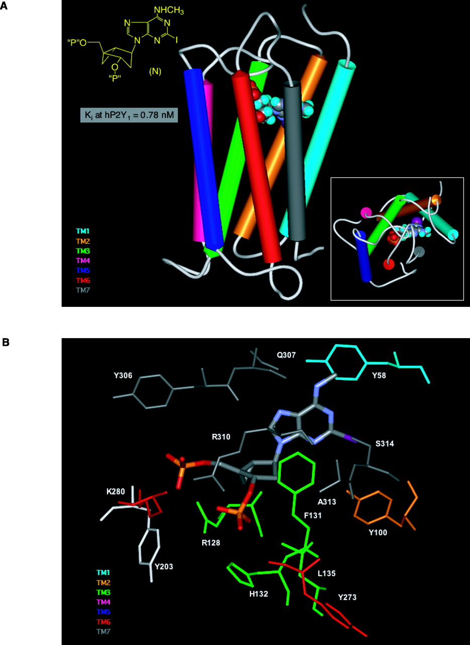 Docking of the high-affinity antagonist MRS2500 at the human P2Y1receptor. A. The basis for the conformational constraint is the methanocarba ring system, in which cyclopentane and cyclopropane rings are fused. The placement of this ring fusion at the 4′ carbon assures that a North (N) conformation is maintained. The large enhancement of affinity produced by this specific conformation within the P2Y receptor family is limited to the P2Y1 receptor (with the possible exception of P2Y14 , which is not yet characterized) (27). “P” represents a monophosphate group. The inset shows the docking as viewed from the extra-cellular side. B. A more detailed image indicates three basic residues, Arg 128 (3.29), Lys 280 (6.55), and Arg 310 (7.39), that putatively coordinate the phosphate moieties (49). The importance of these three amino acid residues in recognition of nucleotides is supported by mutagenesis studies (32). The residues Arg128 and Gln 307 occur roughly one helical turn below the exofacial side of TMs 3 and 7, respectively. [See also (32, 49).]