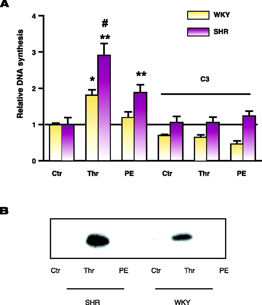 Elevated DNA synthesis and RhoA activation in spontaneously hypertensive rats. A. DNA synthesis in aortic smooth muscle cells from spontaneously hypertensive rats (SHR) and normotensive Wistar-Kyoto (WKY) rats. Cells were grown to confluence and serum-starved for 24 hours and then exposed to either vehicle, thrombin (Thr,12nM) or phenylephrine (PE, 10 μM) for 48 hours and labeled with [3H]thymidine for the last five hours prior to harvest for measurement of [3 H]thymidine incorporation into DNA. [See (45).] B. RhoA activation in aortic smooth muscle cells from SHR and WKY rats is measured as outlined in the text. Cells were stimulated with vehicle, thrombin (Thr,12nM) or phenylephrine (PE, 10μM) for 3 minutes. Cells were lysed and the lysates centrifuged at 14,000 x g for two minutes. The remaining supernatant was either used for Western blot analysis for total RhoA or added to a GST-fusion protein of the Rho binding domain of the Rho effector rhotekin precoupled to glutathione beads, followed by Western blot analysis for active RhoA.