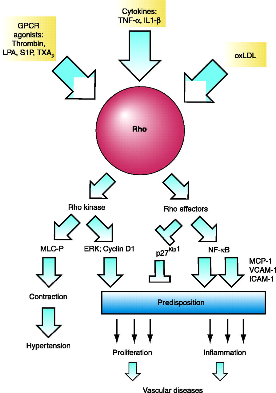 Rho signaling in vascular diseases. The upregulation of vascular RhoA, observed in hypertentsion, is hypothesized to enhance VSMC proliferation and inflammation in response to injury and atherogenesis. Inflammatory mediators including GPCR agonists, cytokines, and oxidatively modified LDL (oxLDL) signal through Rho to produce a variety of cellular responses involved in cell contraction, proliferation, and inflammation. These Rho-mediated responses contribute to the development of vascular diseases. Rho acting through Rho kinase has also been suggested to produce LIM kinase– and stress fiber–dependent activation of ERK, which in turn regulates the timing of cyclin D1 expression and cell cycle progression. It is likely that inflammatory mediators signal through Rho to activate NF-κB, increasing the expression of monocyte chemotactic peptide 1 (MCP-1), and adhesion molecules such as VCAM-1 and ICAM-1, leading to recruitment and adhesion of monocytes to the vascular wall. All of the signaling components mentioned above predispose to vascular disease.