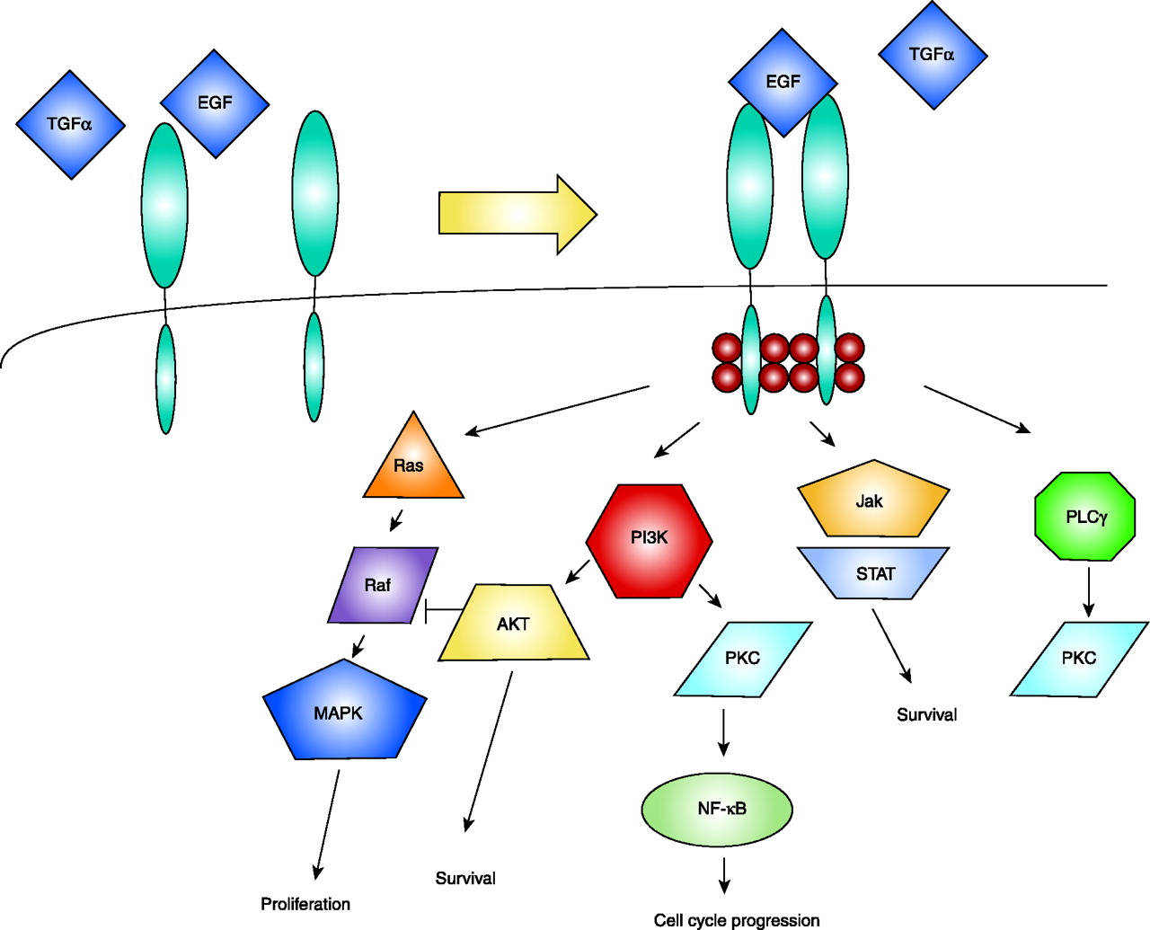 The Epidermal Growth Factor Receptor (EGFR) signaling network. The EGFR is activated upon ligand binding [either EGF or Tumor Growth Factor–α (TGFα)], which promotes homo- or heterodimerization, autophosphorylation (small spheres located on the cytoplasmic domains of receptors), and internalization. Signaling intermediaries include Ras–Raf–MAPK (for proliferation response), PI3K–AKT (for antiapoptotic response), and PKC (for cell cycle progression). PI3K, phosphoinositide 3-kinase; Jak, Janus kinase; STAT, signal transducer and transactivator; PKC, protein kinase C; PLC, phospholipase C; MAPK, mitogen-activated protein kinase; NF-κB, nuclear factor–kappa B.