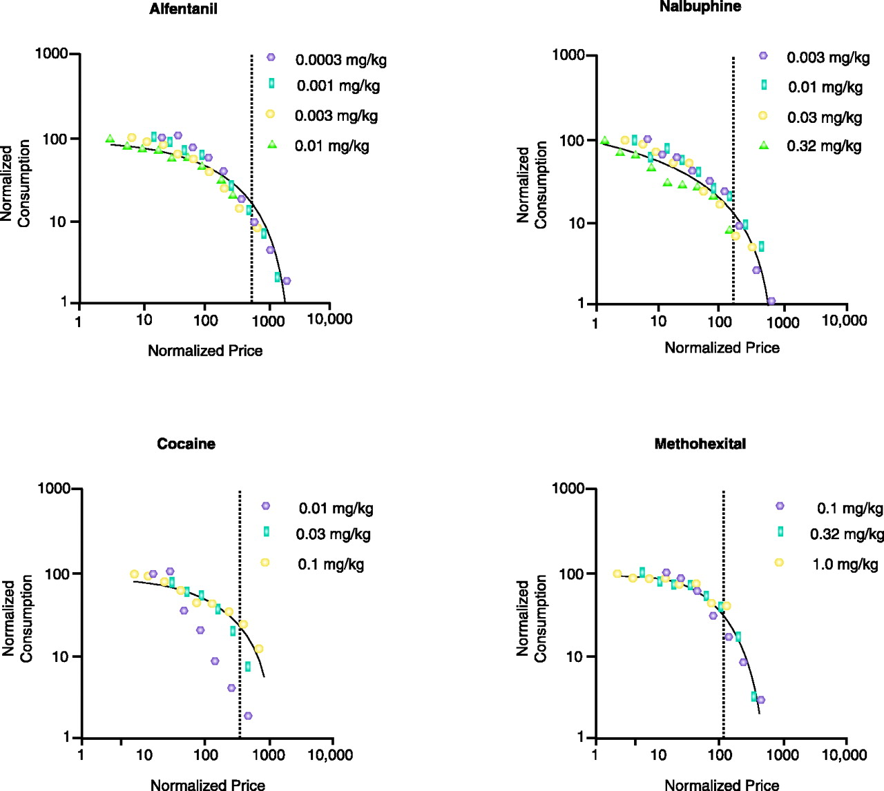 Comparisons of demand for four distinct drugs. Normalization of demand parameters allows for the comparison of demand for four distinct drugs: alfentanil, nalbuphine, cocaine,