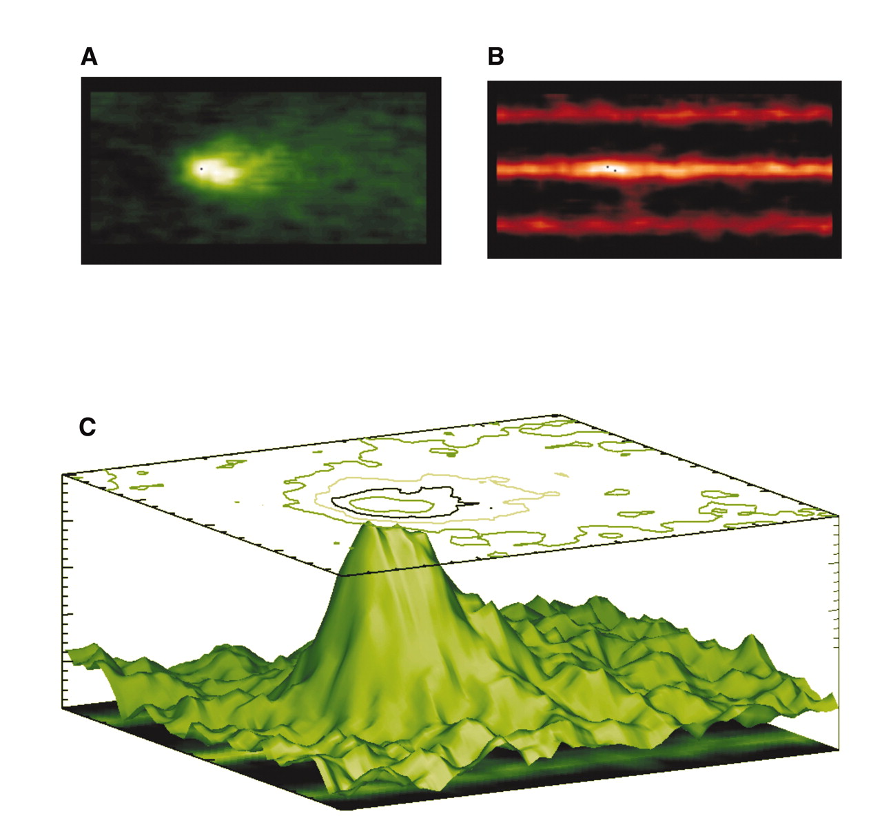Calcium sparks and transverse tubules (TTs). The Ca2+ indicator fluo-3 was loaded into heart cells to enable Ca2+ sparks to be visualized on a confocal microscope. A. Signal-averaged Ca2+ sparks. B. Sulforhodamine B was added to the extracellular solution to image the TTs, and Ca2+ sparks were imaged simultaneously. C. A surface plot shows the relationship between signal-averaged Ca2+ sparks (A) and TTs (B). The site of the origin of the majority of Ca2+ sparks is the TT from the junctional SR (jSR). [See (29).]