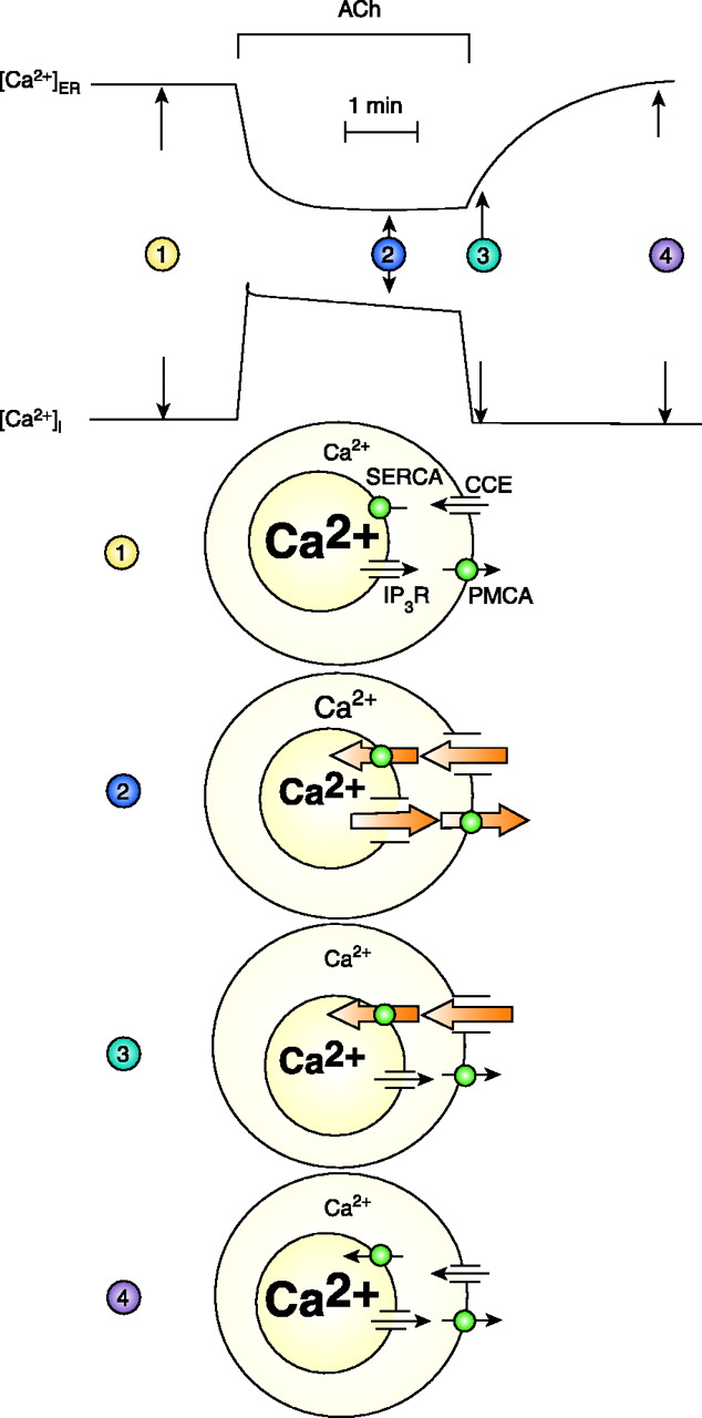 Overall Ca2+homeostasis in pancreatic acinar cell. The top two traces show [Ca2+] in the lumen of the ER and the cytosol, before, during, and after maximal ACh stimulation. Below are shown representations of the state of the four principal Ca2+ transporters in four situations: 1) Rest, before start of stimulation. Small fluxes of Ca2+ through Ca2+ release channels in the ER (for simplicity only the IP3 receptor is shown), ER Ca2+ pumps (SERCA), the plasma membrane Ca2+ pump (PMCA), and the store-operated Ca2+ entry pathway (also known as capacitative Ca2+ entry; CCE). Fluxes across both plasma and ER membranes are in equilibrium. 2) Steady-state stimulated situation. After the initial release of Ca2+ from the ER, both Ca2+ pumps (SERCA and PMCA) are now fully activated and the store-operated Ca2+ entry path is also open, due to the reduced [Ca2+]ER. 3) Immediately after cessation of ACh stimulation. The IP3 receptor channels have closed and the SERCA pump can now refill the ER via Ca2+ entering through the plasma membrane. The PMCA is no longer activated because [Ca2+]i has quickly returned to the basal level. 4) Normal Ca2+ gradients have been restored to the resting basal level. [Adapted from (90).]