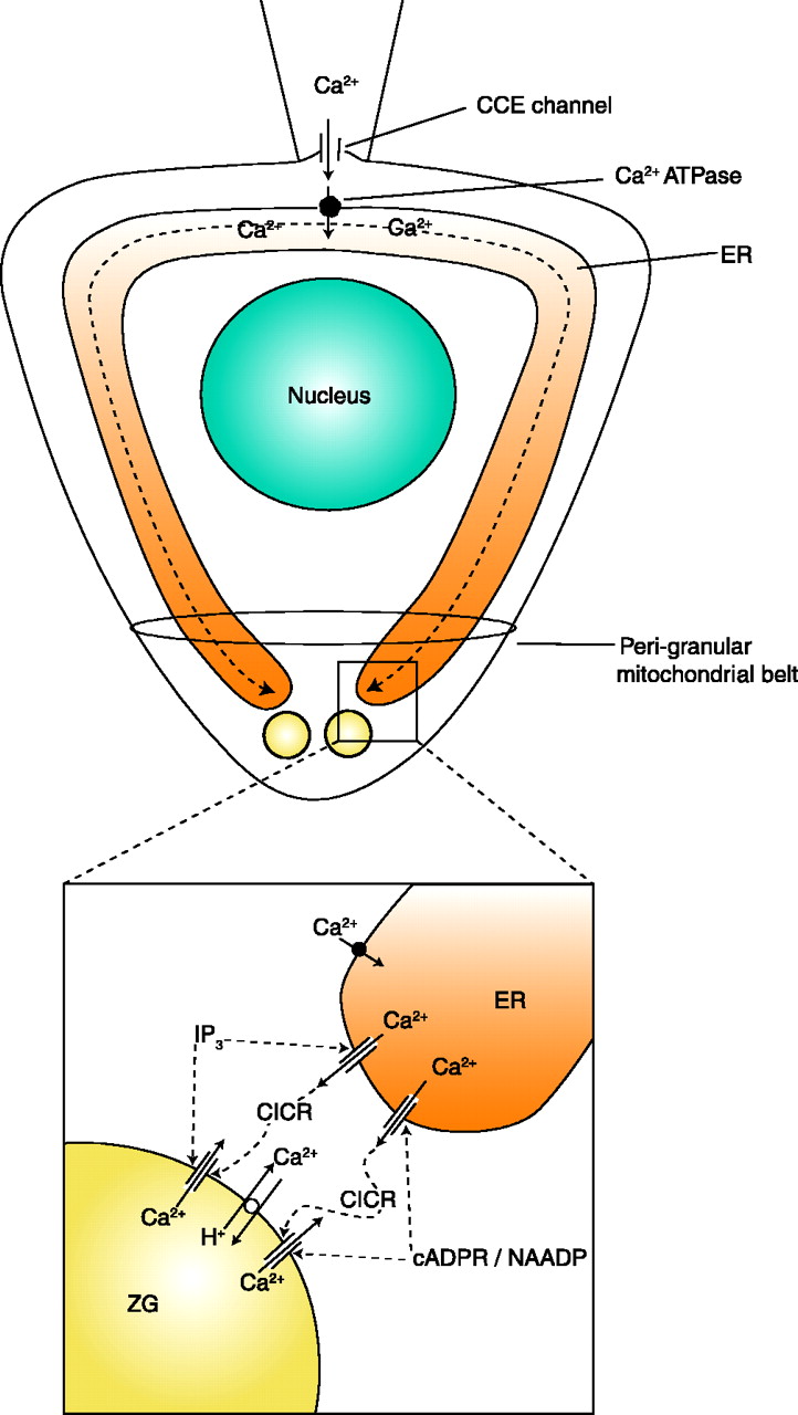 Ca2+signal generation in the apical granular pole. The main (upper) part shows a schematic diagram of a pancreatic acinar cell with the base at the top and the apical pole at the bottom. Ca2+ entry is depicted from a point source (cell-attached patch pipette) at the base. Ca2+ entering (through capacitative Ca2+ entry channels; CCE) is taken up by the ER Ca2+ pump and diffuses in the lumen of the ER towards the apex. At the apical pole, Ca2+ can be released through IP3 receptors and ryanodine channels, which can be stimulated, respectively, by IP3 and cADPR or NAADP (acting via different intermediary receptor proteins, but both ultimately activating the ryanodine receptor). Ca2+ released from the ER terminals can induce further Ca2+ release (CICR) from the secretory (zymogen granules; ZG), assisted by IP3 and cADPR/NAADP. The cytosolic Ca2+ signals are confined to the apical pole by the peri-granular mitochondrial belt. [Adapted and up-dated from (104).]