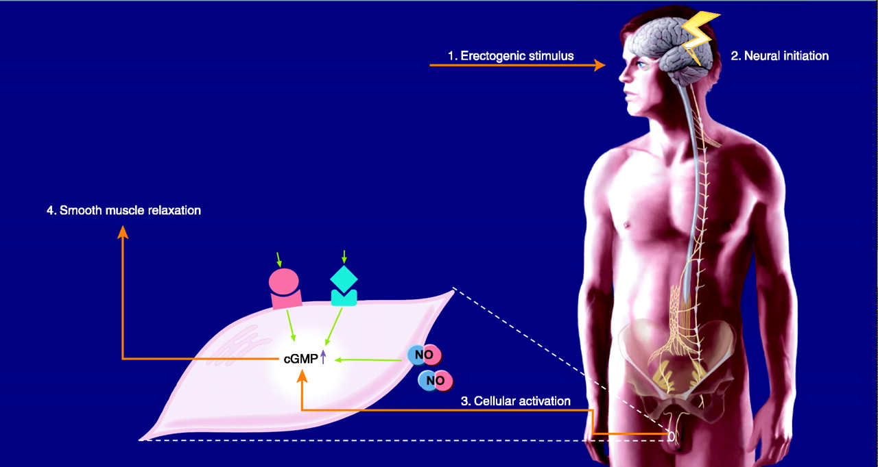 Mechanism of erection. [Modified with permission from International Education Initiative on Erectile Function Core Slide Kit, copyright Physicians World GmbH (2002).]