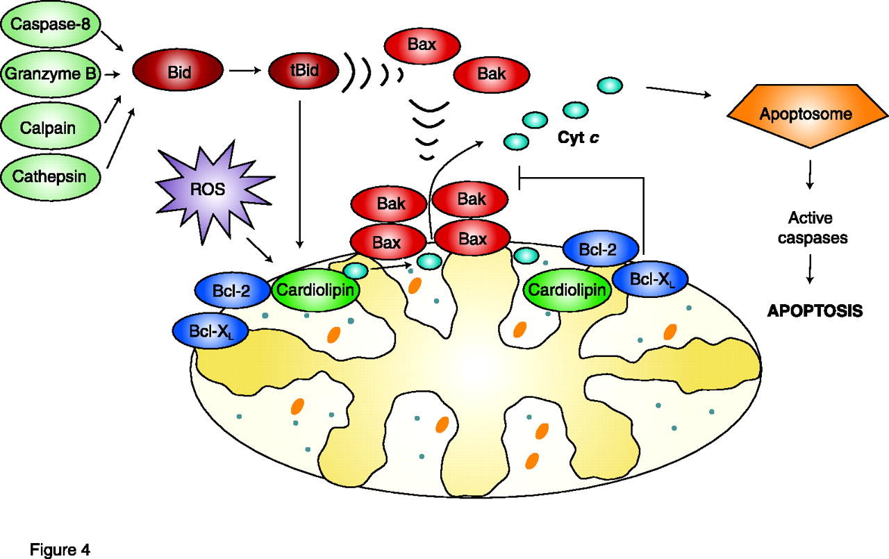 Regulation of cytochromecrelease from mitochondria. The mitochondrial outer membrane is permeabilized by tBid, which promotes the oligomerization and insertion of Bax and Bak. Cytochrome c release is initiated by the dissociation of the hemoprotein from its binding to cardiolipin in the inner mitochondrial membrane, which is stimulated by cardiolipin peroxidation (which is mediated by ROS). Once released into the cytosol, cytochrome c triggers pro-caspase-activation via the apoptosome mechanism.