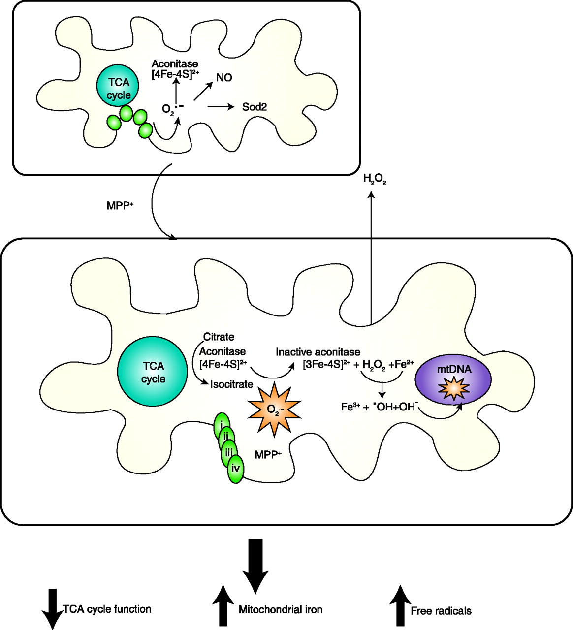 Proposed scheme of events in MPTP-induced mitochondrial O2·−toxicity via oxidative aconitase inactivation. The fate of mitochondrial O2·− is normally controlled by its reactivity with several targets that include Sod2, nitric oxide NO, and Fe-S centers. Elevated steady-state mitochondrial O2·− production resulting from Complex I inhibition by MPTP’s active metabolite, MPP+, would favor oxidative inactivation of the [4Fe-4S]2+-containing aconitase and simultaneous release of Fe2+ and H2O2. Subsequent generation of HO· via Fenton chemistry could damage mitochondrial proteins, DNA, and lipids thereby amplifying O2 −initiated oxidative damage. Additionally, the release of Fe may affect cellular iron homeostasis and decreased aconitase activity could interrupt its TCA cycle function. Adapted from (137).