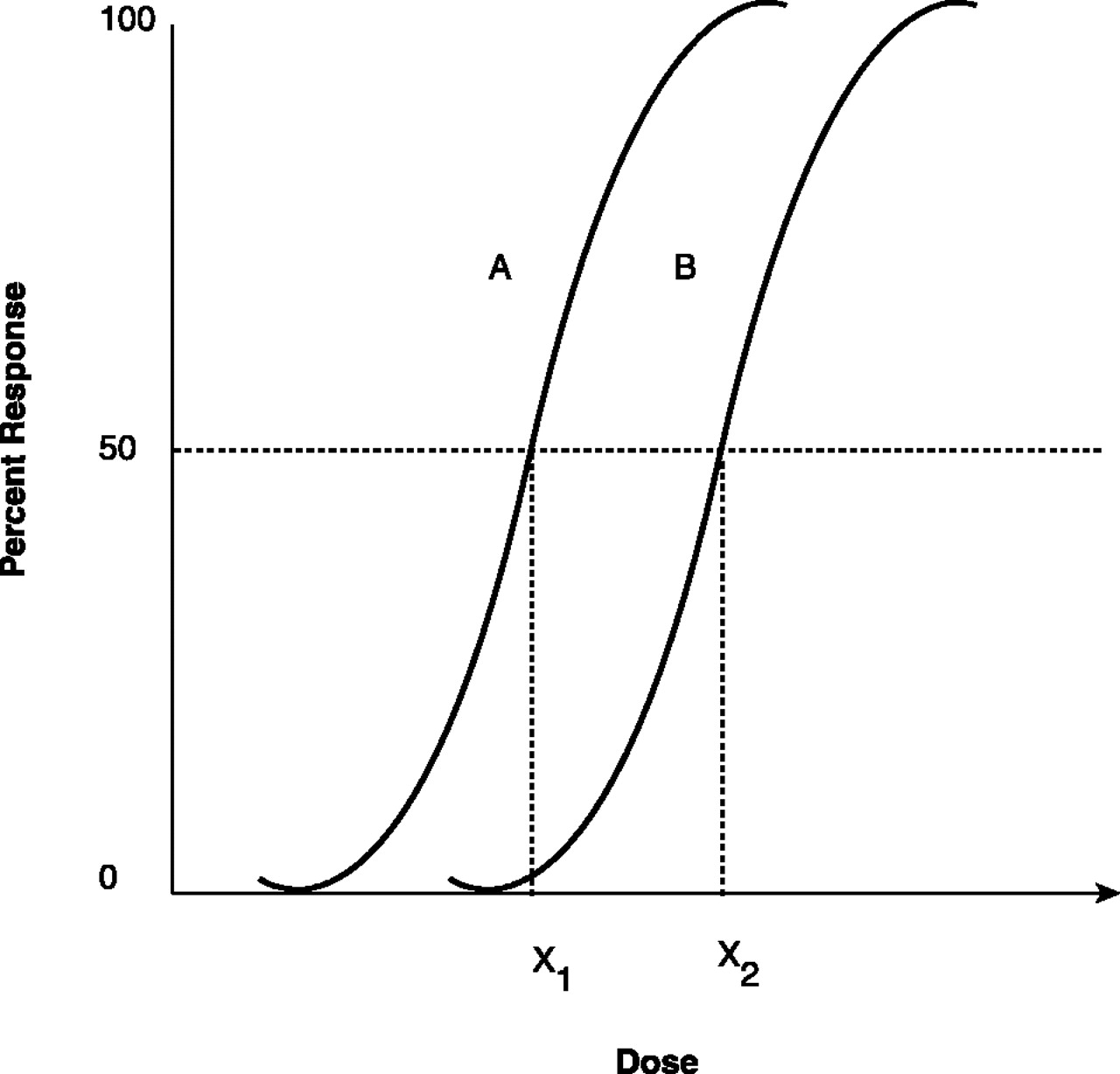 Dose-response relationship illustrating Paracelsus’ quotation using two variables. At dose X1 50 % of a population shows the desired action (A) and at dose X2 50 % of the same population shows an undesired action or side-effect (B).