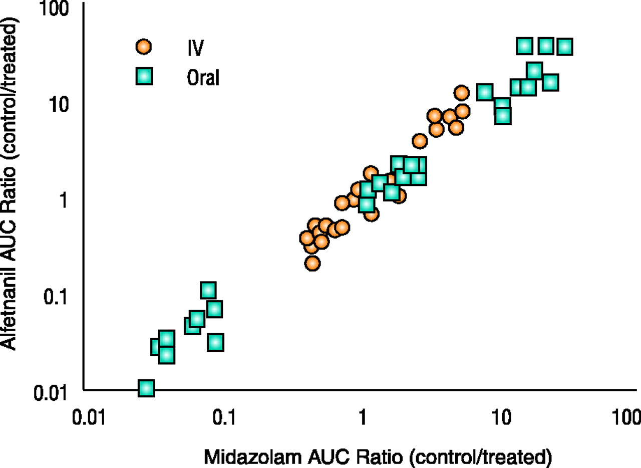 One CYP3A probe (alfentanil) can predict the disposition of another CYP3A substrate (midazolam). Data are the ratios (treated/control) of area under plasma concentration–time curve extrapolated to infinity for oral and IV alfentanil and midazolam, in subjects treated with rifampin (hepatic and intestinal CYP3A induction), troleandomycin (hepatic and intestinal CYP3A inhibition), or grapefruit juice (intestinal CYP3A inhibition). Data are replotted from Kharasch et al. (10).