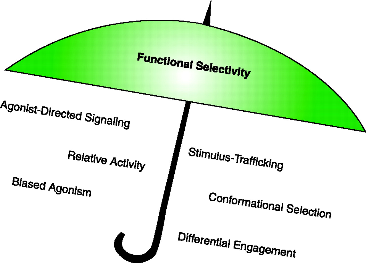 Terms that may fall under the umbrella of functional selectivity. The ability of a ligand to place a receptor in multiple conformations that lead to different intracellular signal transduction events has been described by a number of terms as indicated under the umbrella above. The variety of the terms illustrates the richness of the pharmacology that has been revealed in this area. A standardized nomenclature has yet to be defined. Figure inspired by Arthur Christopoulos.