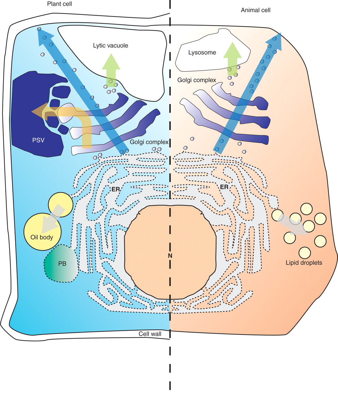 The secretory pathways of plant cells versus animal cells: Opportunities to exploit plants as bioreactors. Secretory proteins enter the ER (delimited here by the broken line, indicating membrane-bound ribosomes) in both cell types and travel to the Golgi complex via vesicular trafficking. In the absence of ER-retention signals, soluble proteins are then secreted (blue arrows). Vesicular sorting to the inner hydrolytic compartments (lytic vacuoles in plants, lysosomes in animals; green arrows) requires signals that differ in plants and animals. In addition to lytic vacuoles, plant cells may also have protein storage vacuoles (PSV), which develop according to specific signals and protein sorting mechanisms (orange arrow) and may be useful in the biotechnological production of recombinant pharmaceutical proteins. Vast amounts of proteins of cereals (e.g., the prolamin storage proteins) form protein bodies (PB) within the ER in aggregation processes that may also be exploited for biotechnology; the aggregation mechanisms are an area of active research and may involve prolonged interactions with chaperones, the formation of inter-chain disulfide bonds, and selective insolubility (28). Oil bodies and lipid droplets originate from the ER by the deposition of lipids in the space between the two monolayers of the ER membrane (gray arrows).
