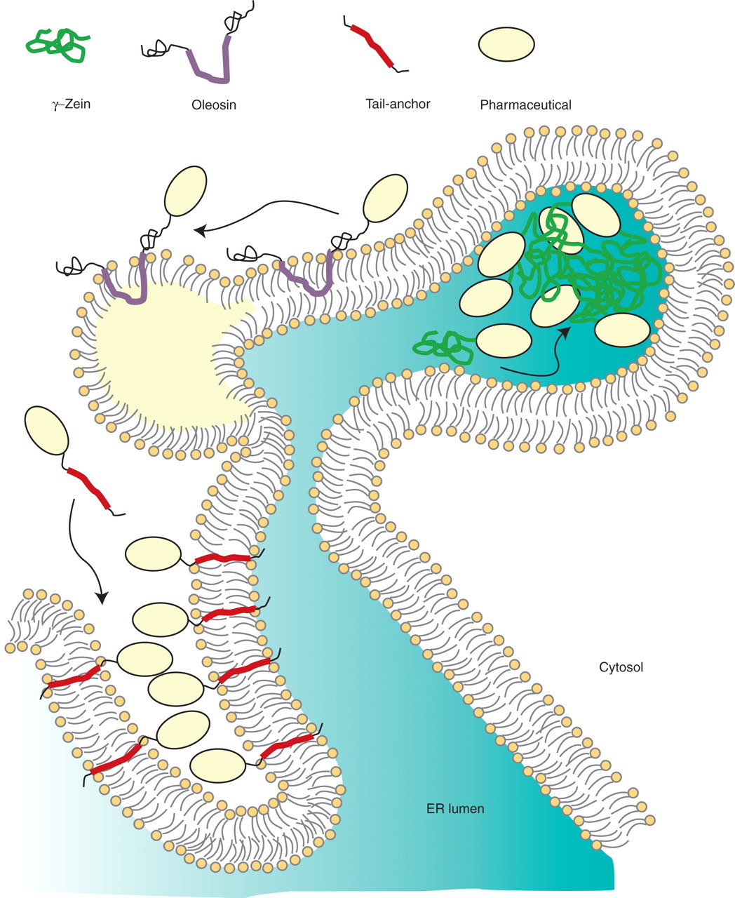 Strategies to accumulate high amounts of recombinant pharmaceuticals in the ER and ER-derived oil bodies. Through the use of plant protein domains (e.g., zein domains, oleosins, or tail-anchors), multiple protein fusions have been examined. Zein domains allow protein body formation within the ER lumen. Oleosin fusion products are first inserted into the external monolayer of the ER bilayer and then integrated into a nascent oil body (yellow). The tail anchor “anchors” recombinant proteins to the ER surface; upon overexpression, the ER can be commandeered in this way to develop distinct topologies that increase the stability of recombinant proteins. The hydrophobic domains of oleosin and of tail-anchored proteins are indicated in violet and red, respectively. Note that the N-terminal and C-terminal domains of oleosin are in the cytosol, and the very short C-terminal sequence of the tail-anchor is instead luminal.