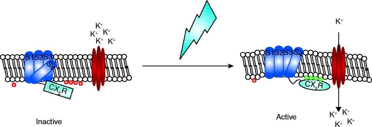 Schematic of potential mechanisms of action of Ci-VSP. The sensor portion of Ci-VSP is shown as dark blue barrels labeled S1–S4 and the phosphatase domain by a light-blue box (inactive) or oval (active). PI(3,4,5)P3 is indicated by red circles whereas PI(4,5)P2 is represented by green circles. The red ovals represent an inwardly rectifying potassium channel (Kir) and the lightning bolt indicates a change in membrane potential and/or conformation. In the absence of a change in membrane shape or potential, Ci-VSP is in its inactive state and the nearby K+ channel is not active. A change in the membrane (lightning bolt) is sensed by the S4 transmembrane domain of Ci-VSP, which then undergoes a conformational change resulting in the activation of the phosphatase. This could occur either by repositioning the phosphatase domain closer to its substrate and/or by changing its conformation thereby activating it. In either case, the localized concentration of PI(4,5)P2 (green circles) in the membrane is increased leading to increased activity of a closely juxtaposed channel.