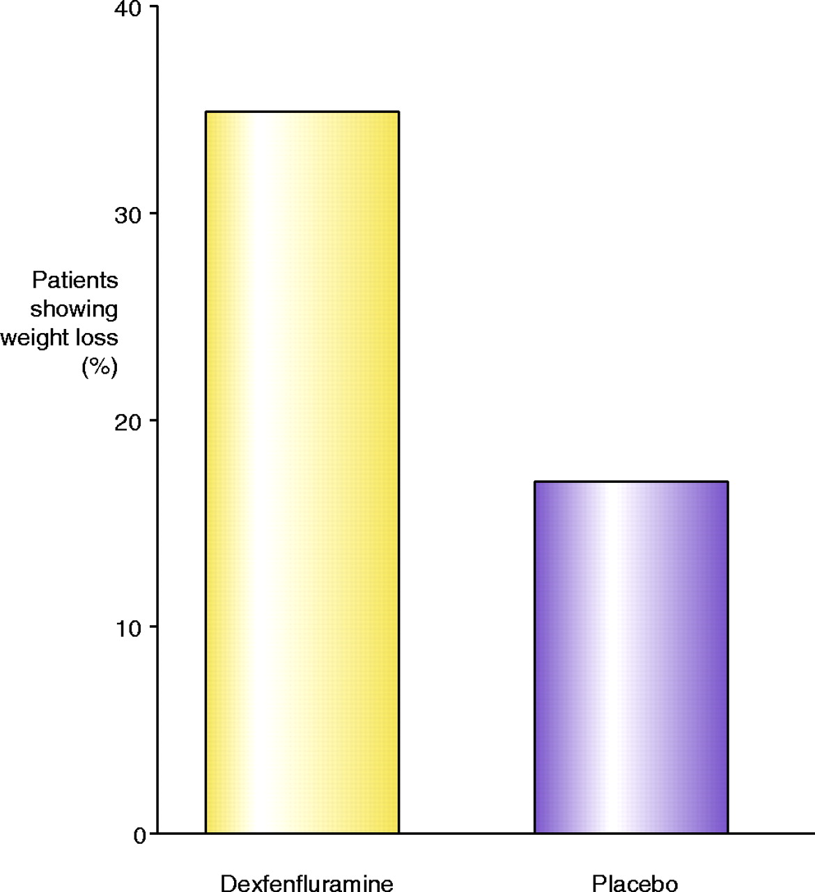 Responsiveness of patients to dexfenfluramine. The percentage of patients from each cohort (drug or placebo) showing more than ten percent loss in body weight (after twelve