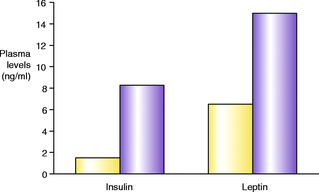 Metabolic peculiarities of mice lacking the serotonin 5-HT2Creceptor. A. The knockout mice (purple)manifest late-onset obesity, weighing thirty percent more than their wild-type litter mates (yellow)after forty-two weeks of age. B. In addition to being hyperphagic, the knockout mice exhibit metabolic hormone changes including the development of hyperleptinemia and hyperinsulinemia. Data reproduced with permission from (62). Copyright Nature Publishing Group 1998.