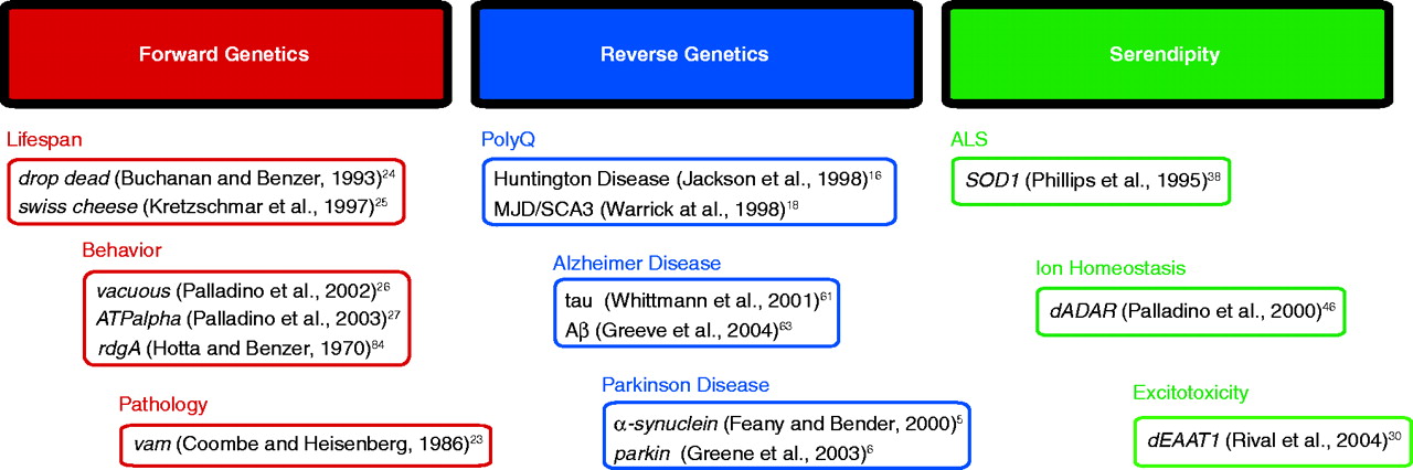 Typical methods of neurodegeneration mutant discovery in Drosophila. Forward genetic screens (red), reverse genetic approaches (blue), and serendipity (green) constitute the main avenues of discovering this class of mutants. For each avenue, representative examples are provided. Forward genetic screens fall into three general classes based upon the method of primary screening (i.e., lifespan, behavior, or histopathology). Reverse genetic approaches are grouped by the human disease they model.