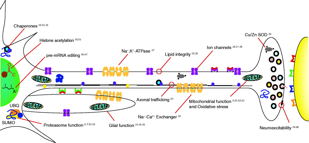 Neural dysfunction associated with Drosophila neurodegeneration mutations or transgenes. Fruit fly research has identified mutations affecting many biochemical functions essential to neuronal maintenance with age, suggesting these may be directly compromised in disease states or may secondarily contribute significantly to disease pathogenesis in humans. These mutants will enable more detailed studies of neural degeneration and senescence. Key references that bear on each process are provided. SUMO, small ubiquitin-like modifier; UBQ, ubiquitin.