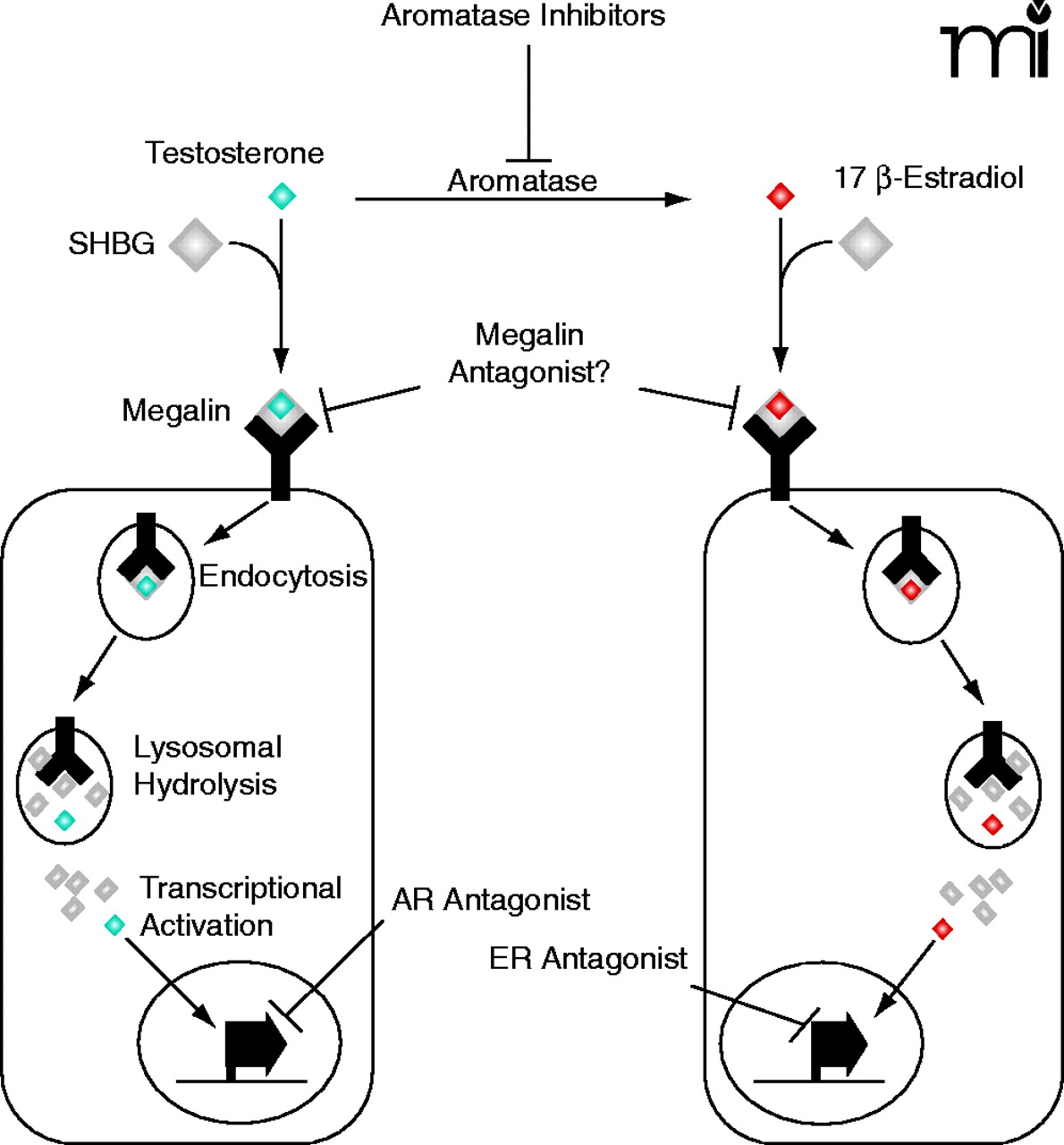 Schematic representation of mechanisms blocking androgen and estrogen actions. Most of the current drugs used to treat steroid-dependent tumors either: 1) block the biosynthesis of steroid hormones (aromatase inhibitors) or 2) prevent transcriptional activation of steroid responsive genes by inhibiting the binding of endogenous steroids to their intracellular receptors (androgen receptor (AR) or estrogen receptor (ER) antagonists). Megalin has been identified as an endocytic receptor for the cellular uptake of steroid/sex hormone binding globulin (SHBG) complexes (7). Development of megalin antagonists, that block the entry of steroids into cells, may serve as an alternative or synergistic treatment to presently available therapeutics.