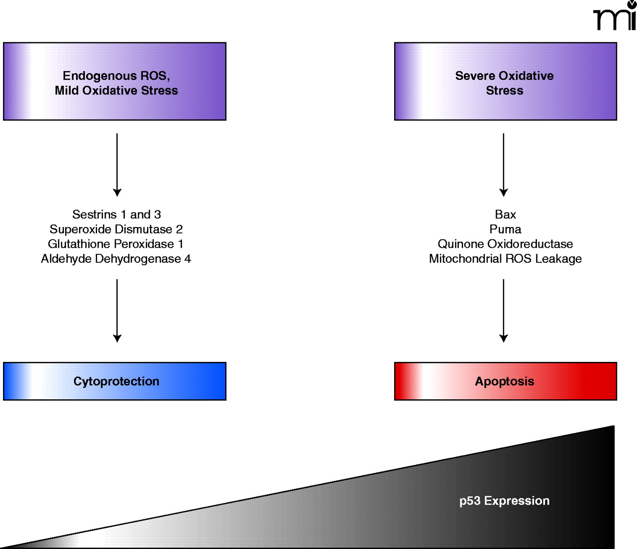 Model of concentration-dependent role of p53 in maintaining cell survival or causing apoptosis. Under normal cellular conditions, amounts of ROS are modest and cells experience only mild oxidative stress. In such situations, p53 positively regulates the expression of antiapoptotic genes that lead to cell protection. Under periods of extensive cellular stress, p53 concentrations increase and a new panel of genes are expressed that lead to apoptosis.