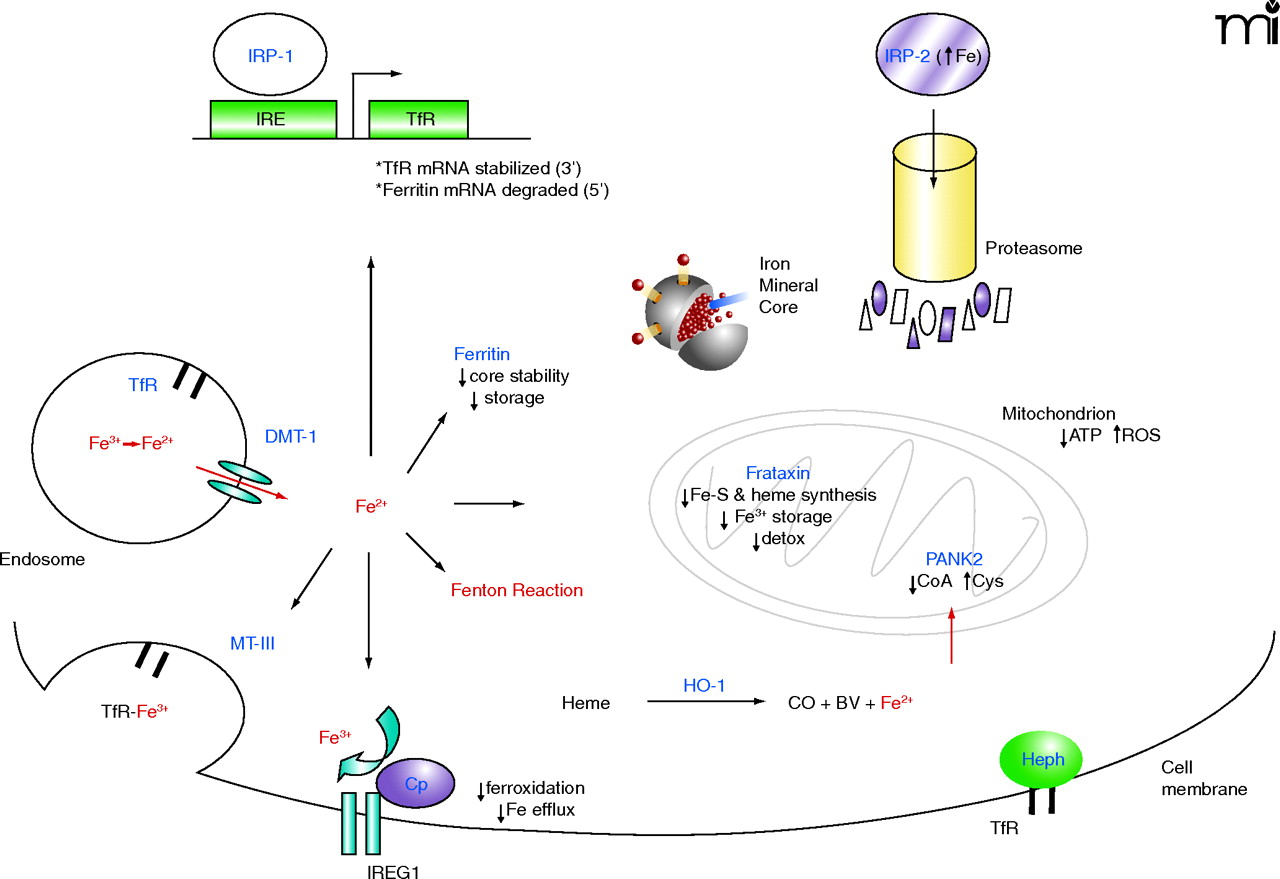 Intracellular fate of ferrous iron. The uptake of iron in the ferric form (Fe3+) is mediated by the transferrin receptor (TfR) and the reductase present in acidified endosomes converts Fe3+ to the ferrous form (Fe2+) before transport into the cytosolic space by divalent metal transporter-1 (DMT-1). The resultant Fe2+ within the labile iron pool (LIP) either: 1) activates the regulatory iron regulatory protein/iron regulatory element (IRP/IRE) system, 2) gets sequestered by chaperones or storage proteins [such as ferritin, metallothioneins (MTs), and frataxin], 3) reoxidizes into Fe3+ and effluxes out of the cell via Cp and IREG1, or 4) participates in iron-catalyzed reactions to generate reactive species [e.g., pantothenate kinase 2 (PANK2)-deficient oxidation of cysteine residues]. Additionally, Fe2+ can be liberated from free heme groups to contribute to the LIP. Heph; hephaestin, a membrane-bound protein homolog of Cp.