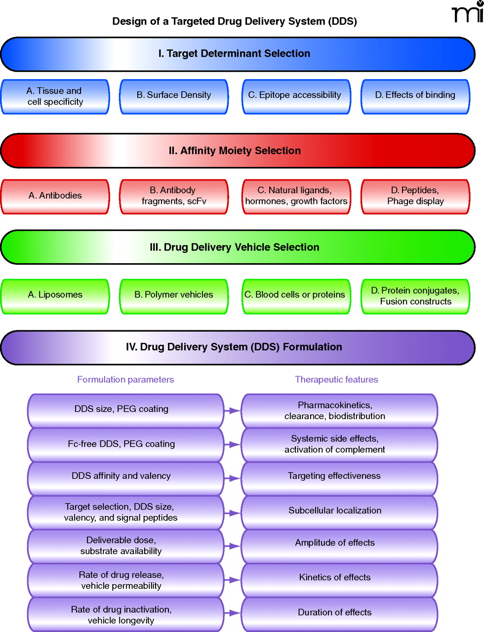 Targeted drug delivery systems (DDS) design. This schematic flowchart illustrates a generic algorithm for rational design and key parameters of a targeted drug delivery system. This review analyzes aspects of this schema that are pertinent to DDS targeting to endothelial cells (EC). For the sake of coordinating diverse parameters, the schema depicts a sequential organization of DDS design, divided into four blocks, from target selection to characterization of its pharmacokinetic and therapeutic features. Each block is divided into a few major parameters or categories. In practice, a DDS design may start with the synthesis of a new drug vehicle potentially suitable for EC targeting or the selection of a peptide that binds to EC or certain subtypes of EC. Final therapeutic features of a given DDS are governed by a complex interplay between factors depicted in all four blocks. For example, circulation and systemic side-effects of a DDS are dependent on the features of both affinity moiety (e.g., Fc fragment–mediated clearance and side effects) and vehicle (e.g., presence of PEG-coating providing stealth features), whereas subcellular localization of a drug is controlled by features of the selected target determinant, valency, and size of DDS.