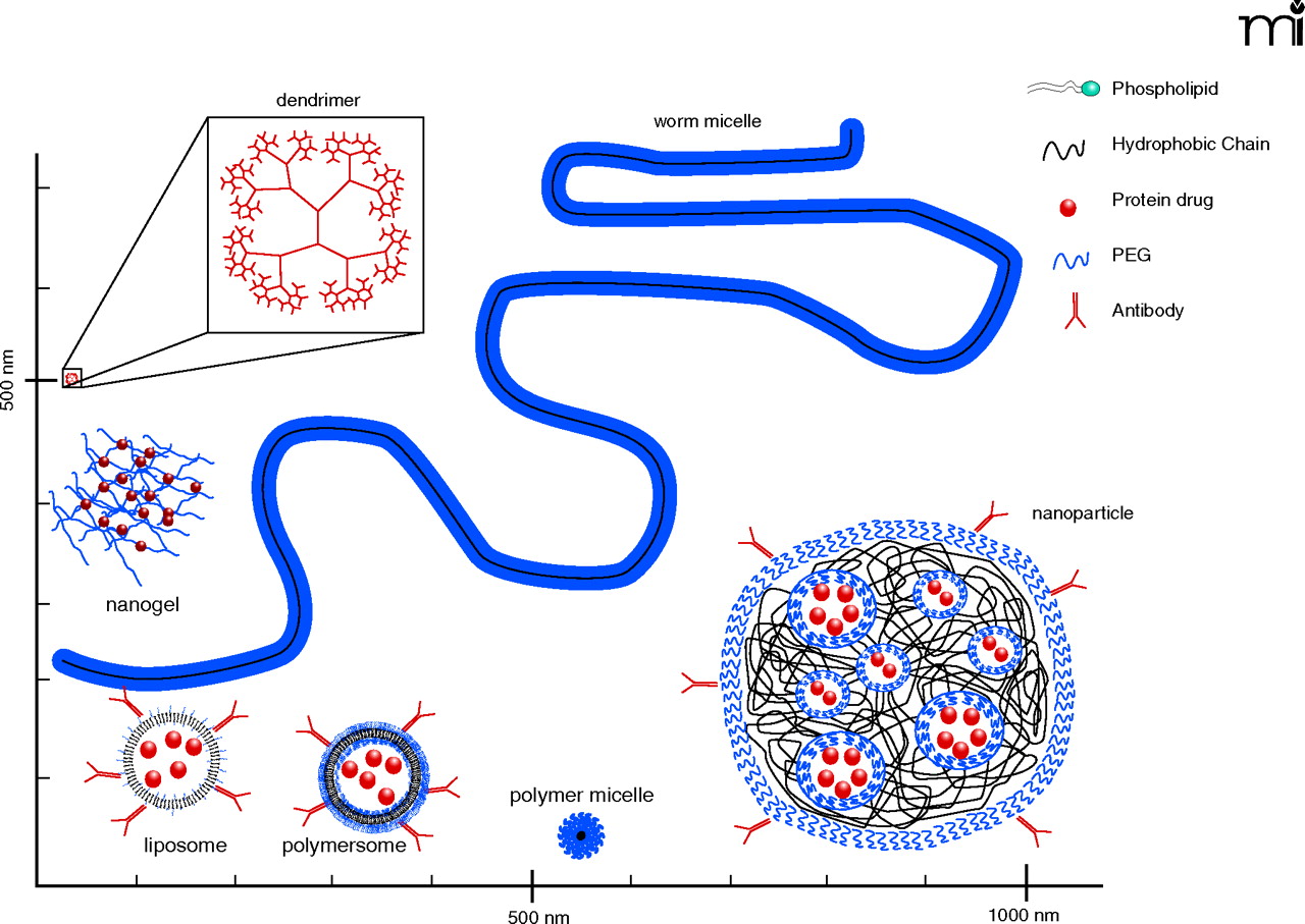 Nanocarriers for vascular drug delivery. Schematic representation of several main types of nanocarriers depicted in relative size scale with limited and oversimplified structural features. All nanocarriers can be surface-conjugated with targeting antibodies (or alternative affinity moieties) and PEG polymer providing stealth features. Dendrimers are the smallest of nanocarriers, in the maximum range of tens of nanometers. They possess multiple end groups suitable for high extent of coupling targeting or active agents. Liposomes, composed of biologically derived phospholipids, are the most common form of nanocar-riers with large aqueous loading potential, yet are also the least stable of carriers. Polymersomes, one of three self-assembled polymeric nanocarriers, are the synthetic polymer analog of liposomes, possessing enhanced stability, dense PEG coating, and therefore prolonged circulation in vivo. Worm micelles are long, flexible cylindrical polymer micelles which possess one of the longest circulation times recorded in vivo. Polymeric micelles are the smallest of the self-assembling polymer aggregate carriers and are the least stable self-assembler. Nanogels are composed of cross-linked polymers with drug entrapped into the ensuing matrix. Their circulation and potential therapeutic uses still remain to be studied. Nanoparticles are solid polymer structures formed through processing rather than self-assembly methods. They represent the largest of the carriers, have the greatest active protein loading capacity measured to date, and are able to protect encapsulated therapeutic enzymes from external proteolysis.