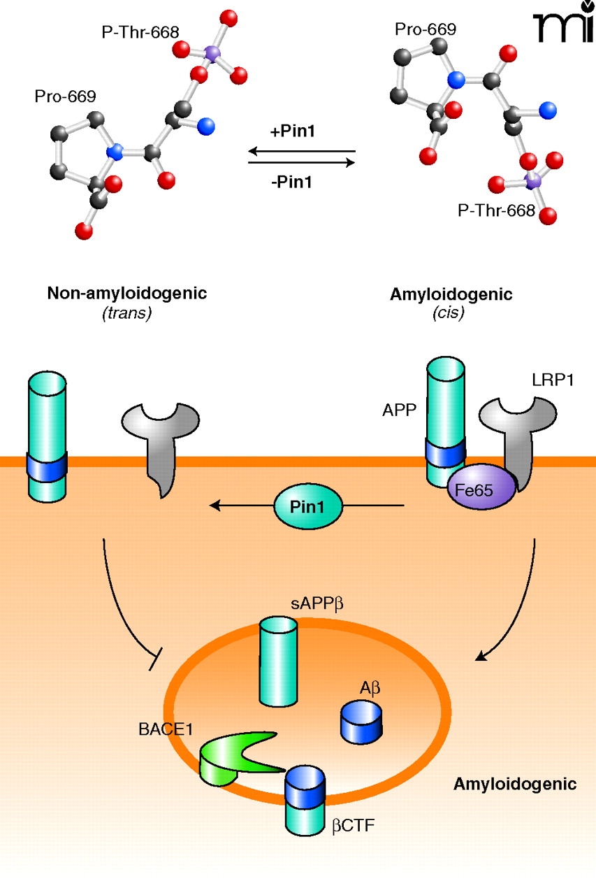 Pin1 promotes isomerization of the phosphorylated APP cytoplasmic domain and non-amyloidogenic processing. The delivery of APP to endosomes for β-amyloid protein converting enzyme 1 (BACE1)–mediated processing proceeds by low-density lipoprotein-receptor-related protein (LRP1)-mediated endocytosis. For this to occur, APP is likely indirectly linked to LRP1 through Fe65 (acting as an adaptor) binding to the tail of APP in a phosphorylation-dependent manner. Pin1 also binds to the tail of APP, especially to the phosphorylated Thr668-Pro669 in cis conformation, and catalyzes conversion to the trans isomer that undergoes rapid dephosphorylation, thus promoting the non-amyloidogenic processing of APP. Enhanced Pin1 activity could also prevent endocytic delivery of APP to BACE1 by competing with the action of Fe65, an activity that may present a novel target to decrease amyloid production.