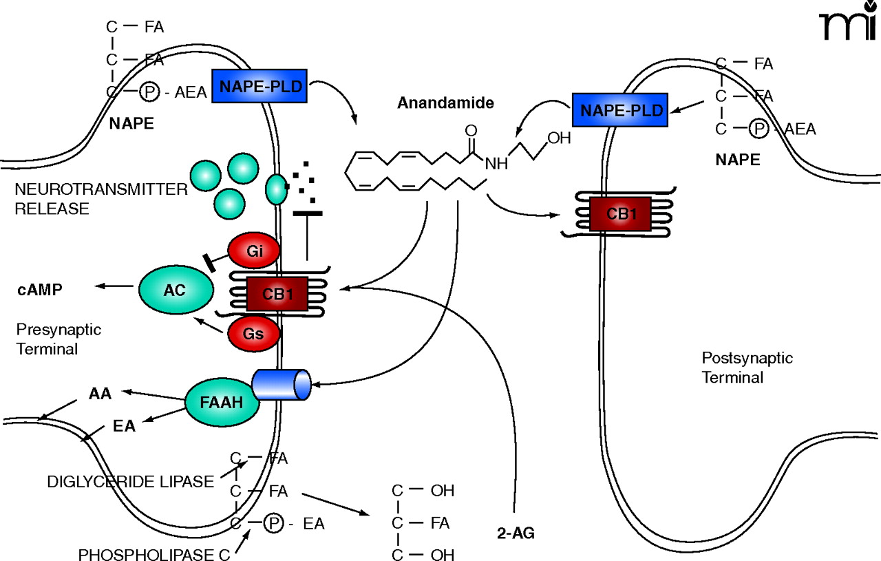 The Endocannabinoid Synapse NAPE (N-arachidonoylphosphatidyl ethanolamine) is hydrolyzed by NAPE phospholipase D (NAPE-PLD) to release free anandamide (AEA). Alternatively, precursor phospholipids are hydrolyzed by diglyceride lipase and phospholipase C to release the resident fatty acid (FA) from the sn-1 position and phosphatidyl-ethanolamine (p-EA) from the sn-3 position, respectively, yielding 2-arachidonoylglycerol (2-AG). Anandamide and 2-AG are agonists at the CB1 receptor. Anandamide can also be released from postsynaptic terminals to signal in a retrograde fashion to presynaptic CB1 receptors. The CB1 receptor either blocks or stimulates adenylate cyclase (AC) depending on cell type. CB1 receptors block neurotransmitter release from the presynaptic terminal. Disposal of anandamide, to yield EA and arachadonic acid (AA), and 2-AG is via movement across the plasma membrane followed by hydrolysis by cytoplasmic fatty acid amide hydrolase (FAAH). As discussed in the text, this movement of anandamide may involve a protein transporter (blue cylinder) that may work in conjunction with FAAH. 2-AG is also transported across the plasma membrane by a similar process and hydrolyzed by monoacylglyceride lipase.