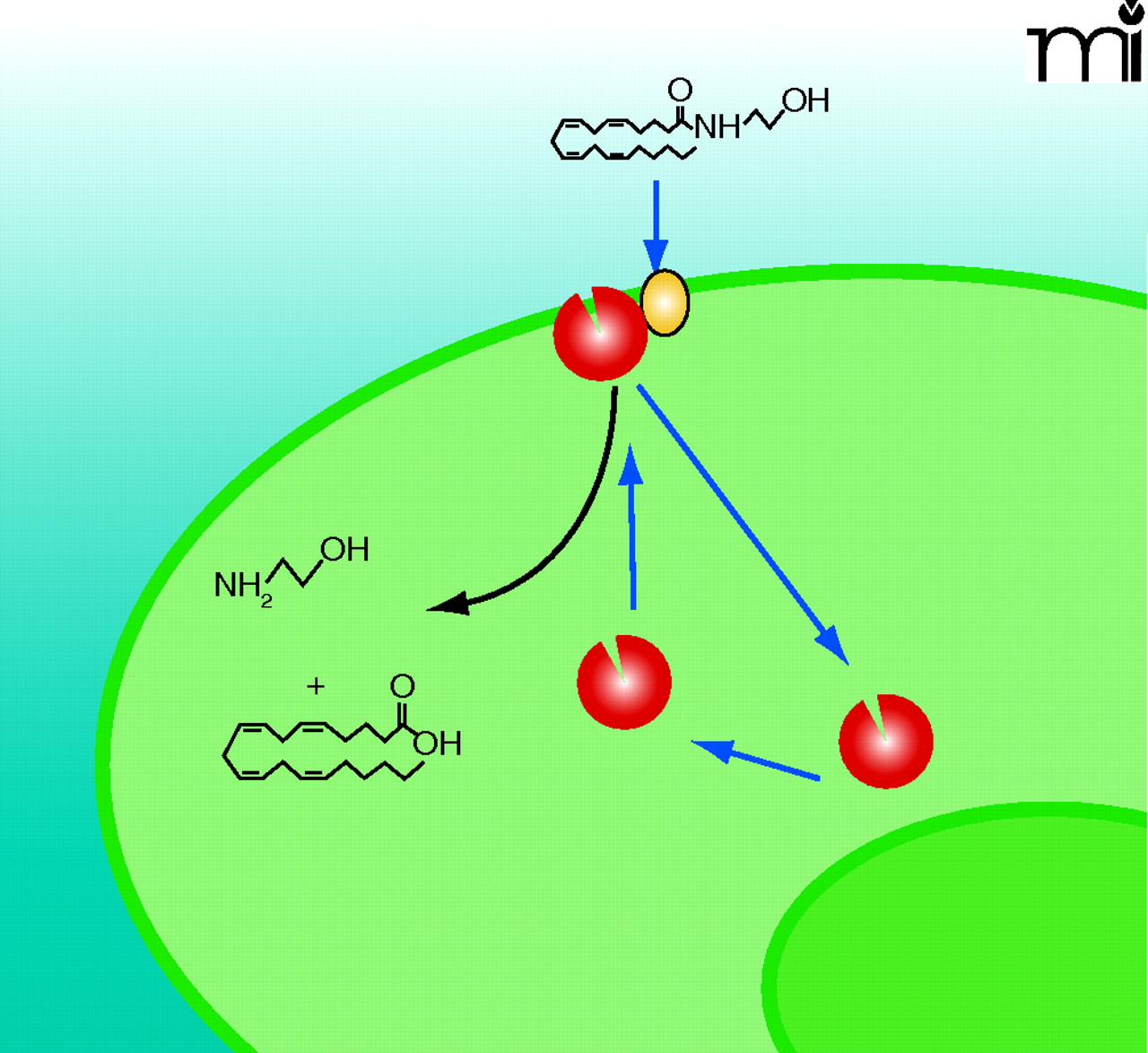 Anandamide Transport by Plasma Membrane-Associated FAAH (Model 1). This model of transport requires fatty acid amide hydrolase (FAAH, red) alone to bind anandamide from the extracellular space directly. The curved black arrow represents FAAH-mediated hydrolysis of anandamide into ethanolamine and arachidonic acid. See text for details.