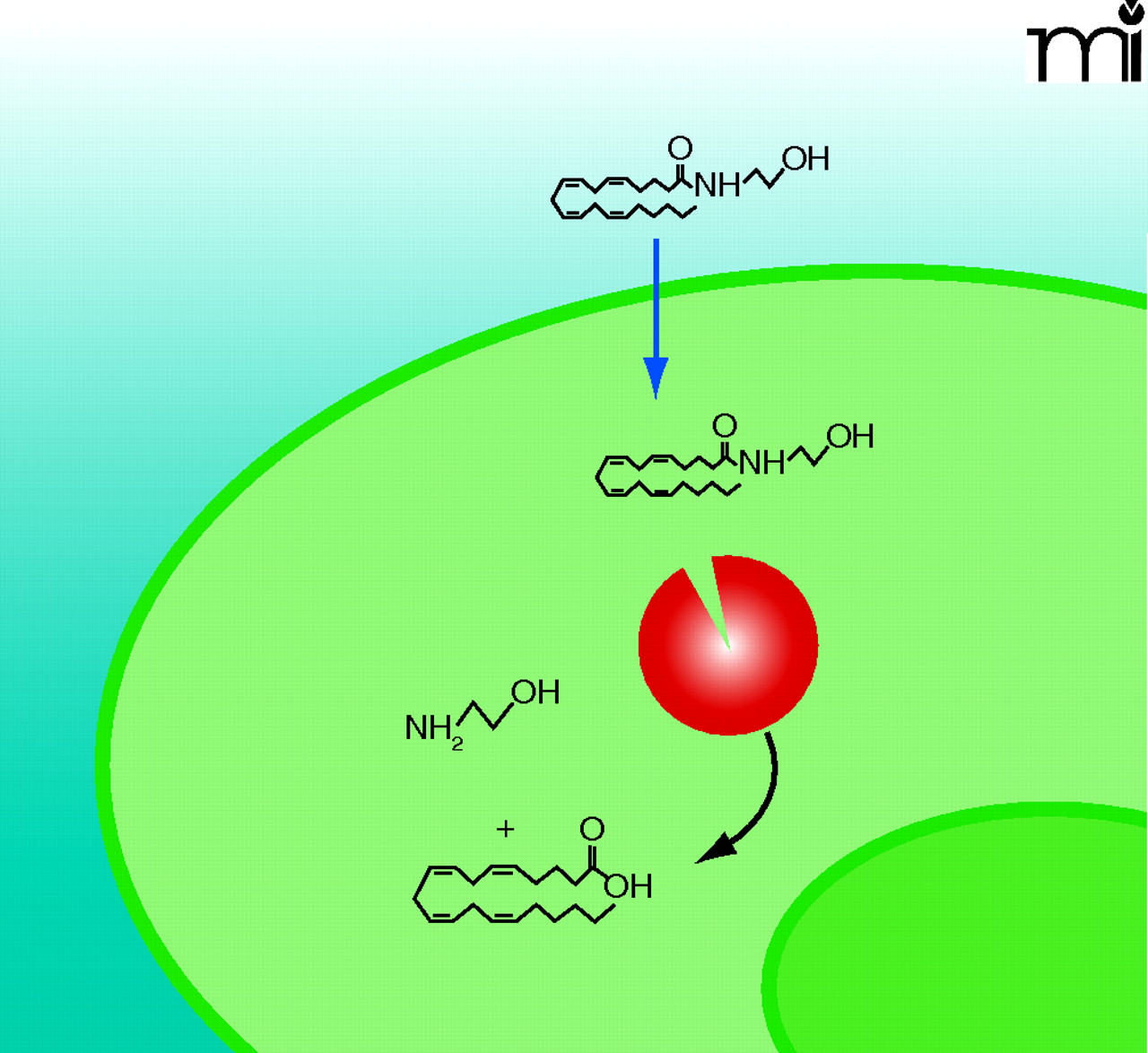 which may involve ancillary binding proteins (orange), and is delivered to cytoplasmic FAAH (red) for hydrolysis.