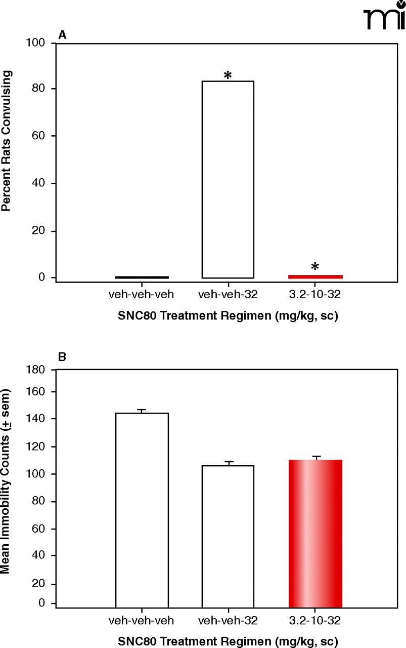 The effects of increasing doses of the delta-opioid agonist SNC80 on convulsions and antidepressant-like effects in the forced swim test. A single dose of 32 mg/kg SNC80 produced convulsions in 83% of rats (A); however, following once daily administration of increasing SNC80 doses, convulsions were absent, but the decrease in immobility in the forced swim test (i.e., the antidepressant-like effects) remained unchanged. Statistical analysis was described in Figure 1 legend. Data were adapted from (37). veh, vehicle; sc, subcutaneous.