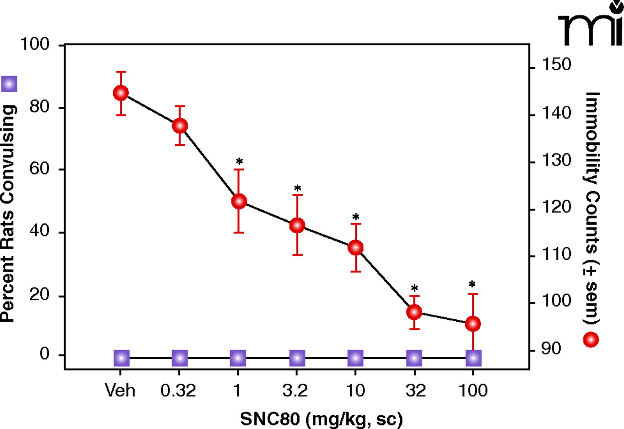 The effects of DPI287 on convulsions and antidepressant-like effects in rats. DPI287 significantly decreased immobility in the forced swim test without producing convulsions at any dose tested. Statistical analysis was described in the legend to Figure 1. Data were adapted from (50).