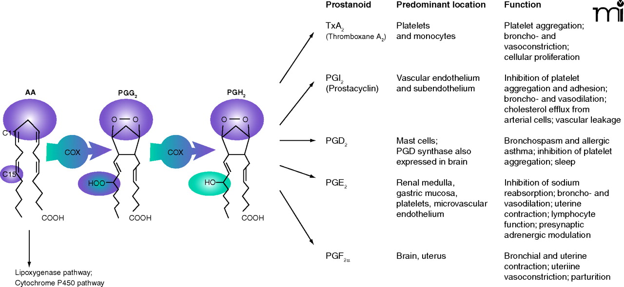The prostaglandin pathway. Synthesis of prostanoids by the COX enzymes following the catalytic release of arachidonic acid from membrane phospholipids by calcium-dependent phospholipase A2. PGH2 is metabolized as indicated by specific synthases. Alternatively, arachidonic acid can be metabolized by lipoxygenase or cytochrome P450 activities to leukotrienes, lipoxins, and hyroxyl/epoxyeicosatetraenoic fatty acids. Reproduced from (67).
