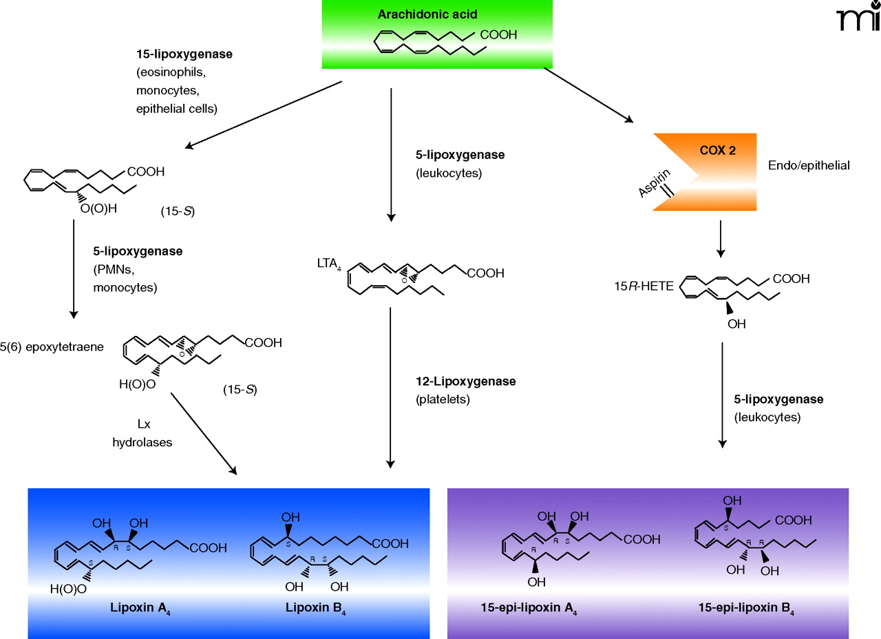 Pathways leading to the production of lipoxins and epilipoxins. I). 15-lipoxygenase produces 15(s)hydroperoxyeicosatetraenoic acid [15S-H(p)ETE], which serves as a substrate for polymorphonuclear leukocyte (PMN) 5-lipoxygenase [5-LOX] to generate 5,6-epoxytetraene. The latter is unstable and is converted to lipoxin A4 and B4 by lipoxin (Lx) hydrolases. II). 5-LOX in PMNs metabloizes arachidonic acid to leukotriene A4 which is taken up by platelets in a transcellular manner and converted by platelet 12-LOX to LxA4. III). Acetylation of the active site of COX-2 by aspirin results in the conversion of arachidonic acid to 15(R)-hydroxyeicosatetraenoic [15(R)-HETE] which when released by endothelial and epithelial cells may be transformed by leukocyte 5-LOX to generate 15-epi-LxA4 or 15-epi-LxB4.