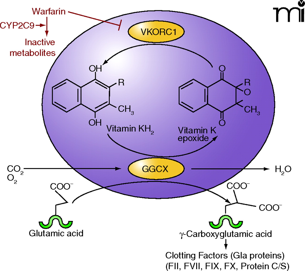 Mechanism of action of warfarin and roles of CYP2C9 and VKORC1 in modulating anticoagulation. Warfarin exerts its pharmacological effect by inhibiting VKORC1. VKORC1 is the vitamin K cycle enzyme controlling regeneration of reduced vitamin K, an essential cofactor that drives formation of the clotting factors. CYP2C9 is the major P450 enzyme that metabolizes S-warfarin to inactive metabolites. CYP2C9, Cytochrome P4502C9; VKORC1, vitamin K epoxide reductase complex 1, GGCX, gamma-glutamyl carboxylase. Adapted from (31).