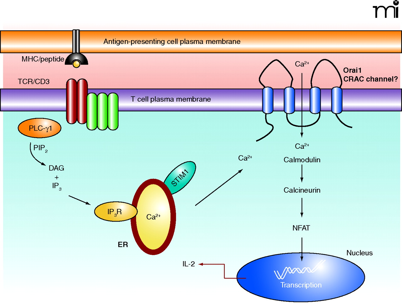 Calcium is essential for the effector processes that occur downstream of T cell receptor activation. T cells recognize antigen in the form of a peptide fragment presented in the context of MHC via the TCR/CD3 complex on the cell surface. (TCR appears as two dark red ovals; CD3 complex appears as three green ovals adjacent to TCR.) Activation results in the phosphorylation of PLC-γ1, leading to the hydrolysis of PIP2, generating DAG and IP3. IP3 causes the release of calcium from stores within the endoplasmic reticulum which is detected by STIM1. This causes the opening of CRAC channels in the plasma membrane and Ca2+ influx leading to NFAT activation, via calmodulin and calreticulin, and the transcription of genes responsible for T cell effector function (i.e., IL-2). TCR, T cell antigen receptor; MHC, major histocompatability complex; PLC-γ1; phospholipase C–γ1; PIP2, phosphatidylinositol bisphosphate; DAG, diacylglycerol; IP3, inositol-3,4,5-trisphosphate; IP3R, inositol trisphosphate receptor; ER, endoplasmic reticulum; NFAT, nuclear factor of activated T cells; CRAC, Ca2+-release-activated Ca2+channel; IL-2, interleukin-2.