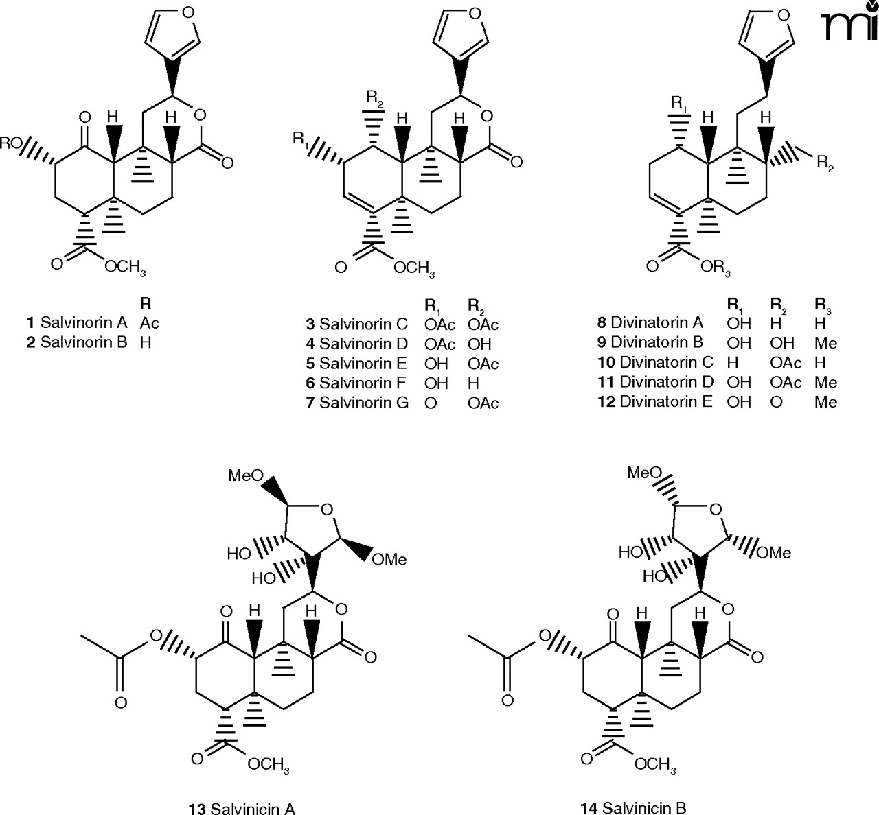 Structures of salvinorin A and B and related diterpenes isolated fromSaliva divinorum.