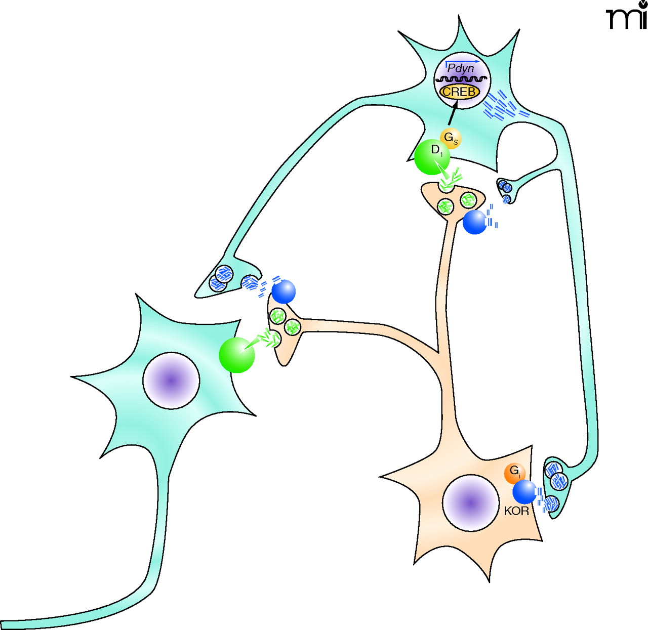 Potential role of the KOR–dynorphinergic signaling complex in the treatment of mood disorders. This figure depicts the mesolimbic reward pathway that has been implicated in mood disorders. Dopaminergic neurons project from the ventral tegmental area (orange) to GABAergic neurons in the nucleus accumbens (blue). Synaptic dopamine (green triangles) release can lead to activation of Gαs-coupled D1 dopamine receptors (green spheres) resulting in accumulation of cyclic AMP, and subsequent activation of the cAMP response element binding protein (CREB) that regulates transcription of dynorphin (blue rectangles), the endogenous KOR ligand (46). In this model, dynorphin activates the presynaptic KOR that modulates dopamine release in the nucleus accumbens. Stress-induced increases in CREB activity have been associated with depressive-like behaviors in animal models, similar to the behavioral effects observed with administration of KOR-selective agonists such as salvinorin A, which decrease extracellular concentrations of dopamine within the nucleus accombens. These CREB-induced depressive behaviors can be attenuated with KOR-selective antagonists (47), further implicating a role for the KOR-dynorphinergic signaling pathway in the treatment of depressive-like behaviors.