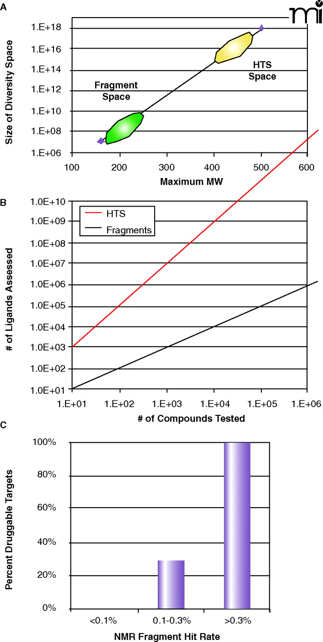Fragment diversity space. A. A plot of the size of the potential chemical diversity space as a function of the maximum molecular weight for the compound collection (extrapolated from 21 and 22). Note that the y-axis is in log-scale and ranges from 106 to 1018. The approximate regions of diversity space for fragment libraries and conventional HTS collections are denoted by green and yellow ovals, respectively. B. A plot of the virtual number of ligands assessed as a function of the actual number of compounds tested for fragment screening (red line) and conventional high-throughput screening (black line). For HTS, as no linking of the individual hits is proposed, the number of ligands assessed is exactly equal to the number tested. However, in a linked fragment approach, the number of virtual ligands is M*NP, where N is the number of compounds tested, P is the number of independent but proximal subsites on the protein, and M is the number of linking possibilities (23). The example shown here is for (P=2, M=10) as a function of N. C. The observed frequency of being able to inhibit protein targets with potent, non-peptde, non-covalent small molecules as a function of the experimental hit rate from an NMR fragment screen (24).