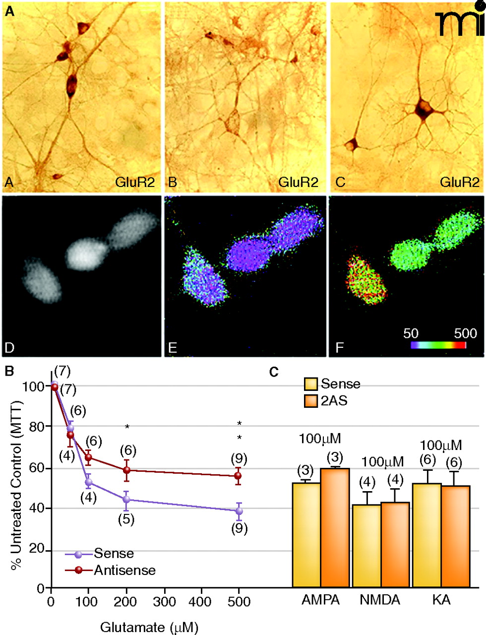 Dissociation between elevated Ca2+permeability and neurotoxicity. A. GluR1A and GluR2B immunolabeling of hippocampal neurons sevety-two hours after exposure to GluR2B AS-ODNs. (A). In sense strand–treated controls, GluR2B protein expression was intense and uniform within the somata and weaker in the dendrites of single cells. (B). After GluR2B knockdown, somatic immunolabel was highly reduced at this time. (C). In sister cultures, GluR1A protein detection was intense within the cell body as well as proximal and distal dendritic processes indicating a rise in the GluR1:2 ratio. Ca2+ imaging experiments showed corresponding pharmacological rises in AMPA receptor-mediated Ca2+ permeability. (D). Basal Ca2+ levels in GluR2B AS-ODN–treated culture. (E). Pseudocolor micrographs of basal Ca2+ levels in GluR2B AS-ODN–treated culture. (F). Puff application of AMPA under the same conditions significantly increased [Ca2+]i in the same neurons. B. and C. Effect of GluR2B knockdown on L-glutamate- (B) or KA- (C) treatment on cell viability in hippocampal cultures. On day twelve, cultures were treated with GluR2B AS-ODNs, and on days thirteen or fourteen, cultures were treated with excitotoxins. Data represent the mean ± SEM of 3-(4,5-Dimethylthiazol-2-yl)-2,5-diphenyltetrazolium bromide (MTT) mean values at 570 nm that were quantified from control and experimental hippo-campal cultures. Modified from (77, 143). Reprinted with permission.