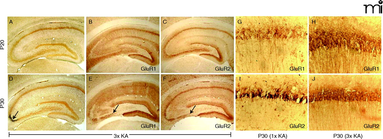 Preservation of CA1 neurons and CA1 AMPA protein after 3×KA. A. Control photomicrographs of P20 silver stained section showing no argyrophilia. At P20 (A) and P30 (D) after 3×KA treatment, the CA1 was protected but CA3 damage shown as black staining was present. At P20 and P30, GluR1A (B, E) and GluR2B (C, F) protein levels were similar to controls (see Fig. 1⇑), except for in the CA3 region associated with cell loss (arrow). At P30, GluR1A immunolabeling (G) was significantly decreased in CA1 whereas GluR2B was increased (I). Steady levels of GluR1A and GluR2B were observed after 3×KA (H, J). Modified from (32, 45). Reprinted with permission.