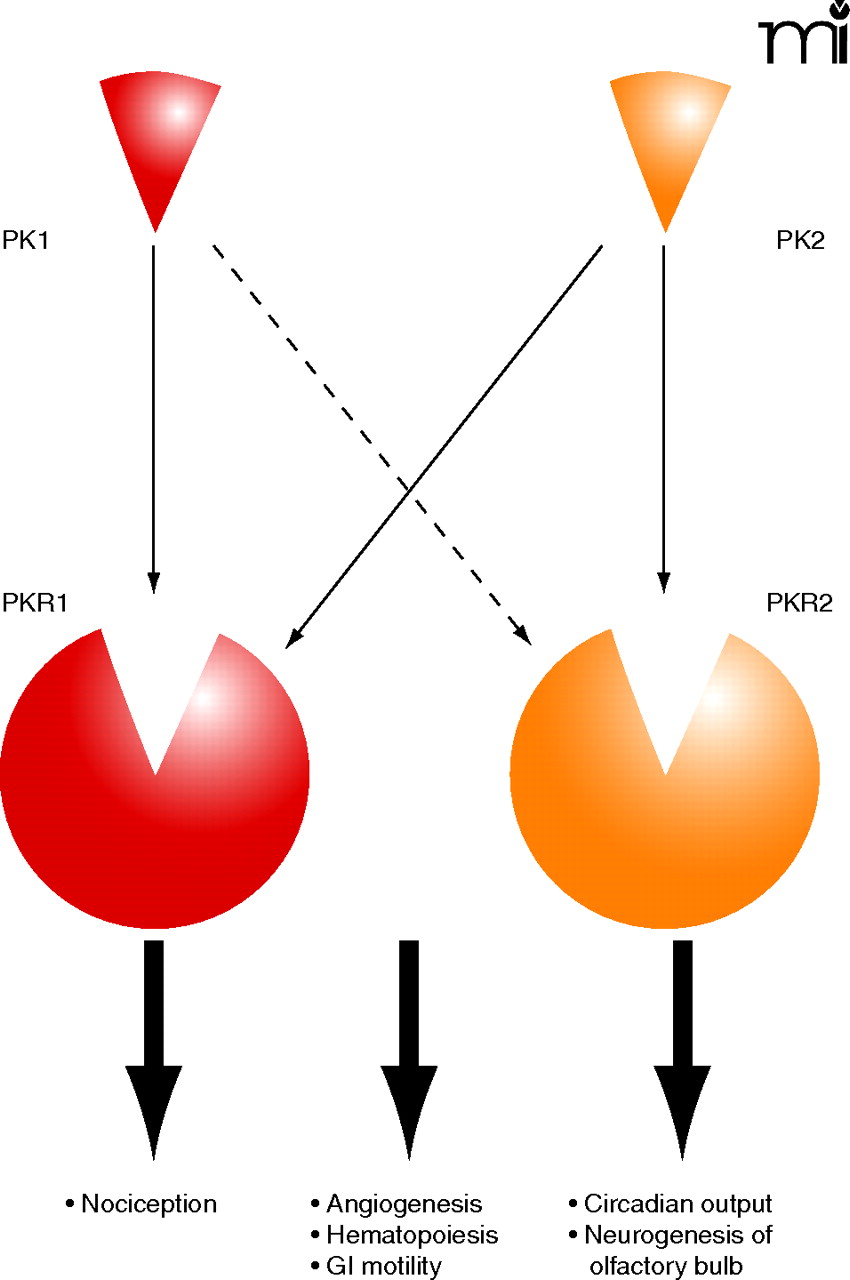 Biological functions of prokineticins. Prokineticins (PK1 and PK2) are a pair of cysteine-rich secreted molecules that exert their functions via activation of two G protein–coupled receptors (PKR1 and PKR2). Prokineticins are versatile molecules that regulate multiple biological processes, with apparent selectivity of ligand/receptor pairing. In particular, PK2/PKR2 signaling is critical for circadian clock output and neurogenesis of the olfactory bulb (OB), whereas the PK2/PKR1 pair plays a dominant role in pain perception. Prokineticins also regulate other processes, including gastrointestinal smooth muscle motility, angiogenesis, and hematopoiesis, where the involvement of ligand/receptor pairing is largely unexplored. The dashed arrow implies that PK1 and PKR2 may form a complex in unidentified functions.