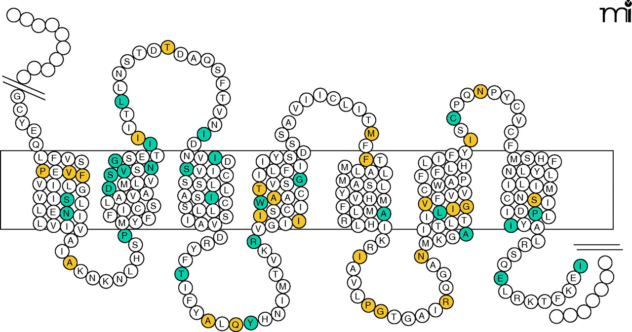 Distribution of missense mutations in the melanocortin type 4 receptor (MC4R). Like all GPCRs, the MC4R is composed of seven transmembrane domains connected by three intra- and three extracellular loops. Inactivating mutations in the MC4R are indicated in inherited forms of obesity. Amino acid substitutions at sixty positions have been found in obese humans (colored circles), but only half of missense mutations reveal a partial or complete loss of receptor function (blue circles).