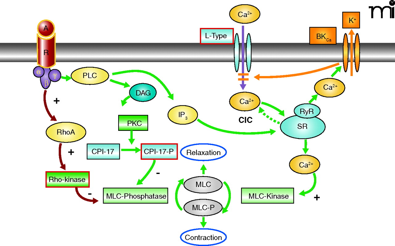 Major signal transduction pathways that modulate myocyte tone. Aspects of these pathways could serve as a benchmark for phenotypic characterization of bioengineered muscle. [(+) denotes a positive or stimulatory effect; (−) denotes a negative or inhibitory effect. BKCa, the calcium-sensitive K channel (maxi-K), although clearly there are several types of K channels known to be present in detrusor myocytes; SR, sarcoplasmic reticulum; RyR, ryanodine receptor; PLC, phospholiapse C; DAG, diacylglycerol; PKC, protein kinase C; IP3, inositol trisphosphate; MLC, myosin light chain; A, agonist; R, receptor; CPI-17, protein kinase C-potentiated protein phosphatase-1 inhibitory protein.]