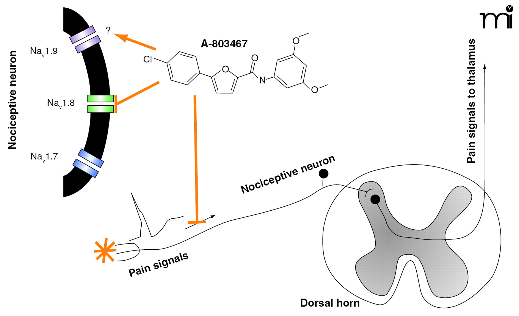 Inhibiting Nav1.8-dependent nociception. The small molecule A-803467 potently inhibits Nav1.8 tetrodotoxin-resistant (TTX-R) channels in nociceptive neurons. A-803467 also inhibits action potentials in depolarized neurons or spontaneously active neurons following peripheral inflammation. A-803467 is relatively ineffective at inhibiting Nav1.7 channels, which are now known to participate in nociception. It is not known, however, whether A-803467 can inhibit Nav1.9, another TTX-R sodium channel that is expressed in large amounts in nociceptive neurons and can contribute to inflammatory pain. Orange star indicates pain stimulus.